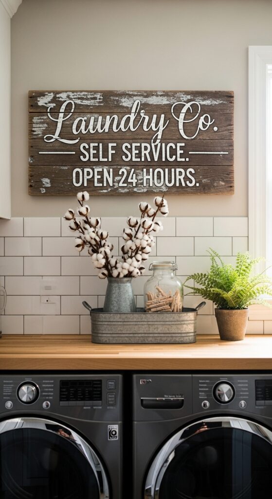 Hang a farmhouse sign with a laundry message that adds personality and humor to the room.