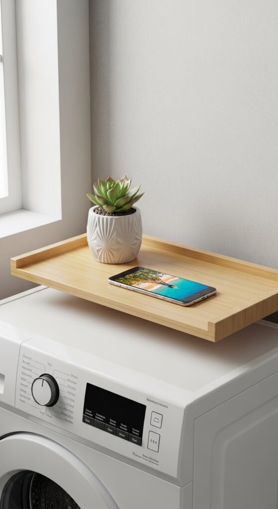 Install a small shelf with a raised lip on the wall near your washer and dryer.