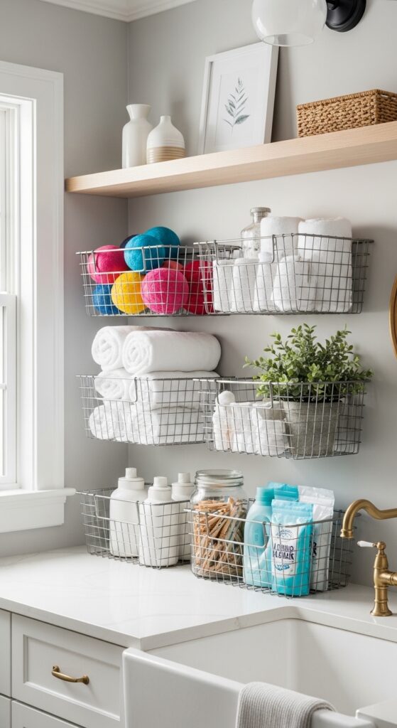 Wire baskets are not just for produce. They make excellent wall storage for laundry rooms.
