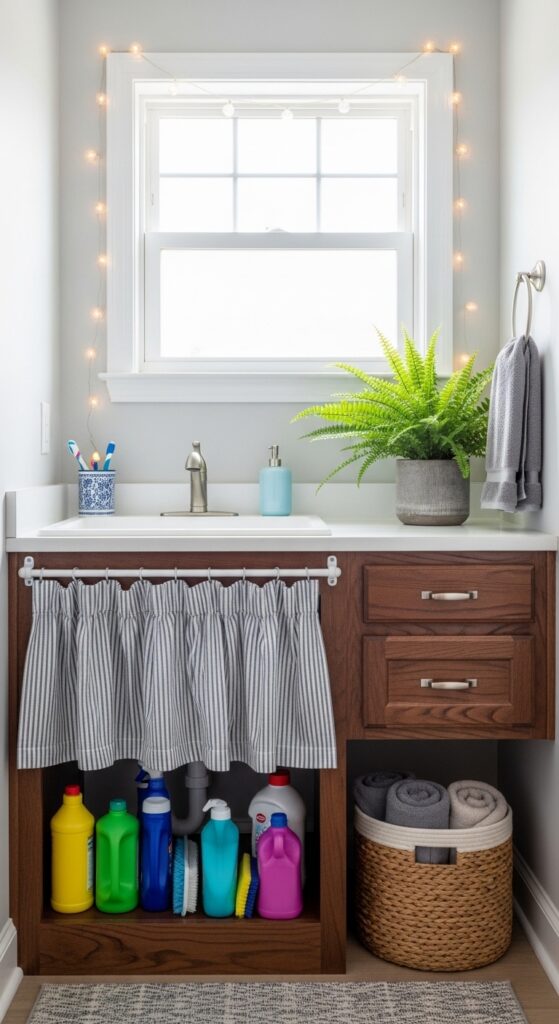 The curtain hides everything under your sink. Cleaning supplies disappear from view.