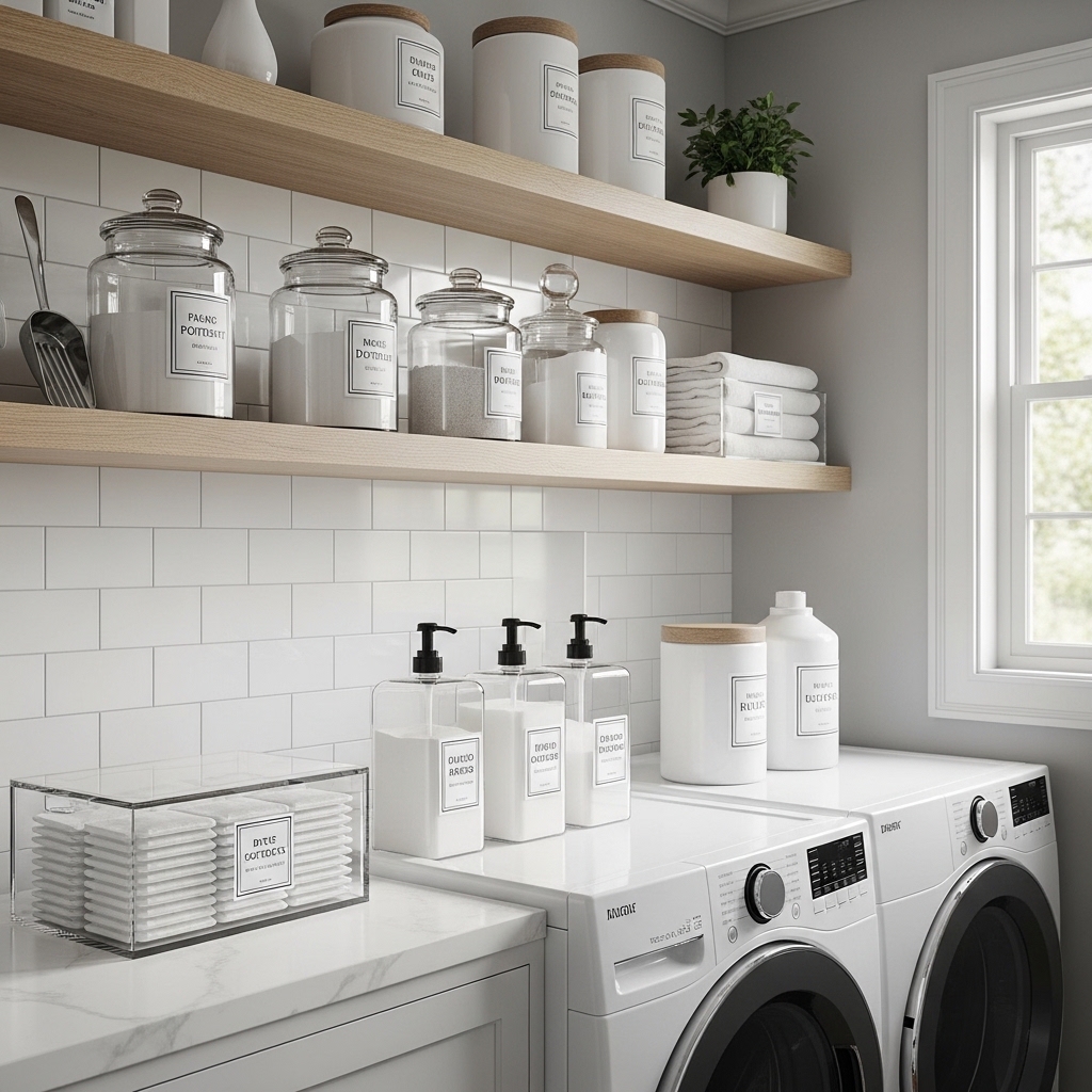 Transfer powdered detergent, pods, and dryer sheets into clear glass or acrylic containers.