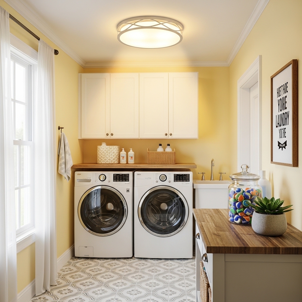 Most laundry rooms have a single bare bulb or a cheap fixture that casts harsh shadows.