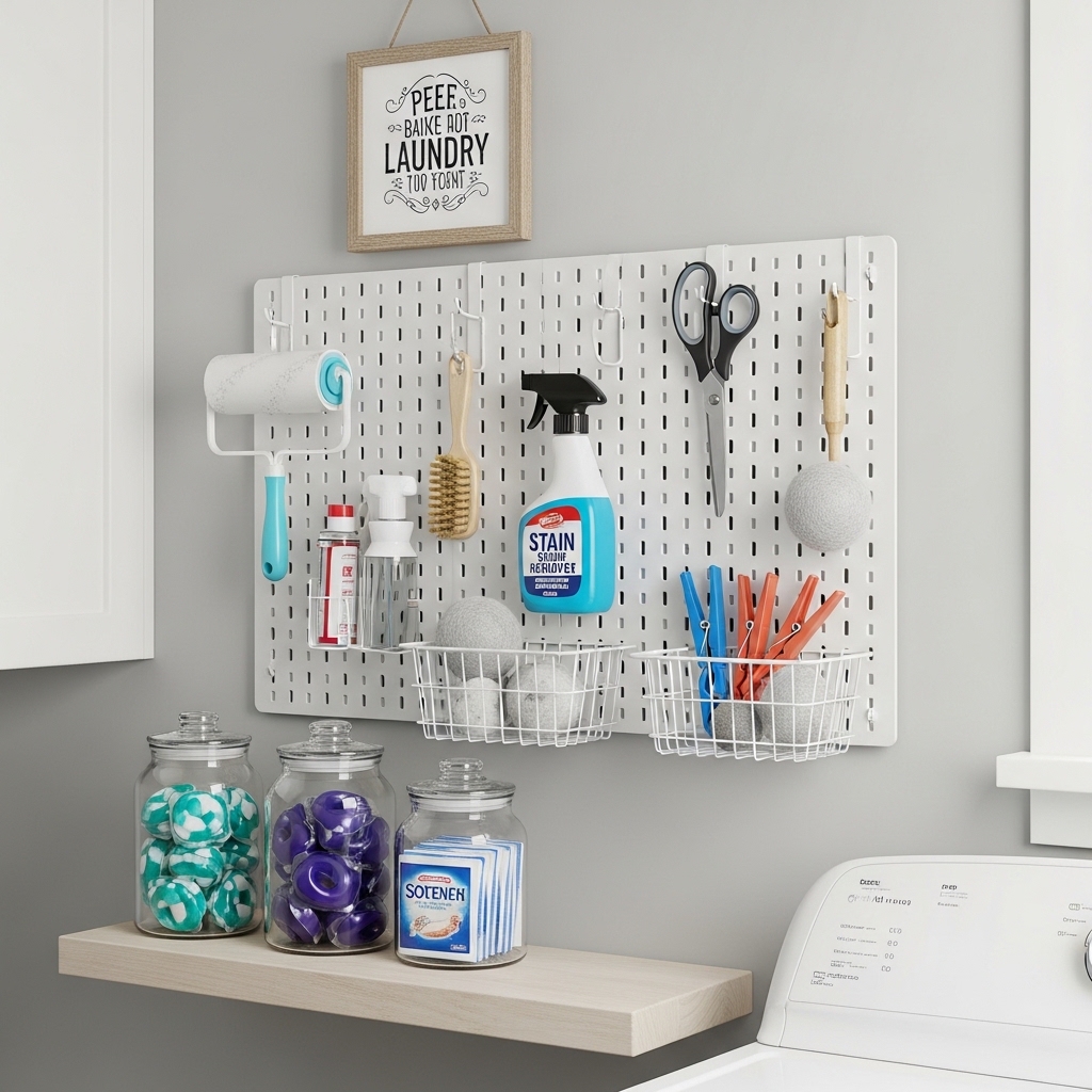 Pegboards keep tools visible and accessible. No more digging through drawers during laundry time.