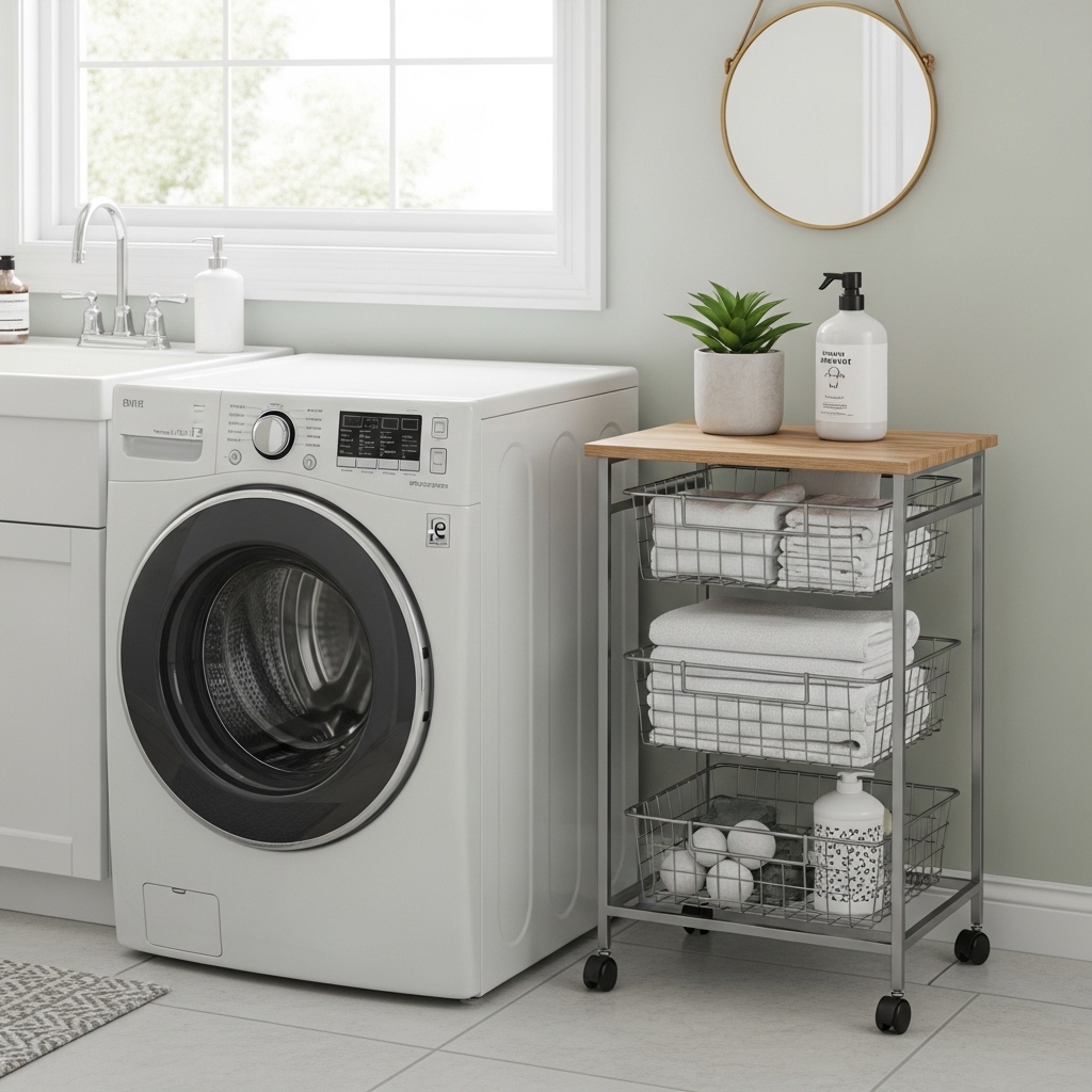 Use the cart for detergent pods, dryer sheets, stain pens, and lint rollers.