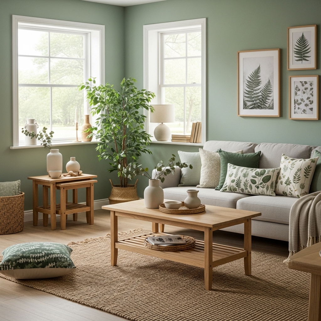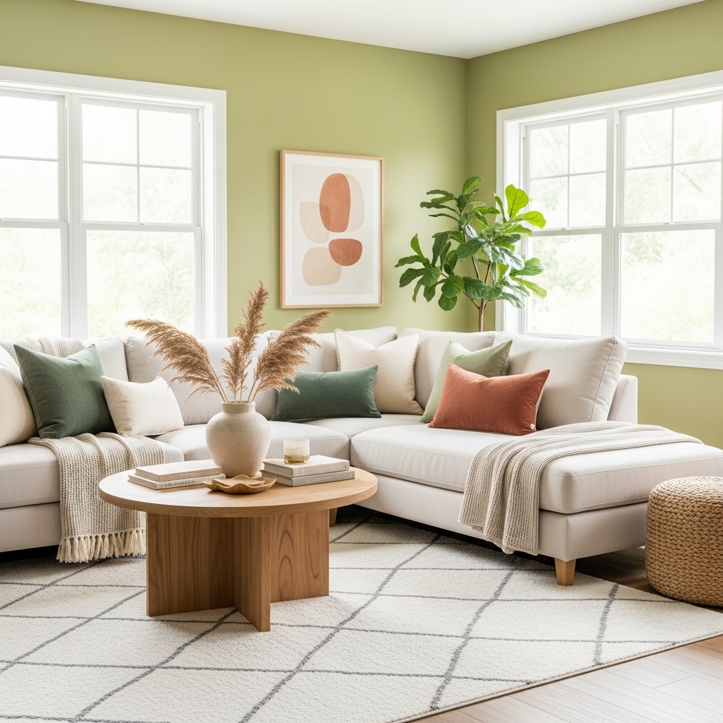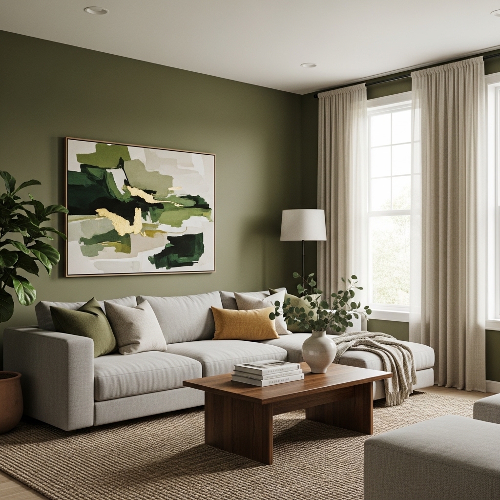 Olive green adds depth while maintaining a connection to natural tones. It creates a grounded, cozy feel.