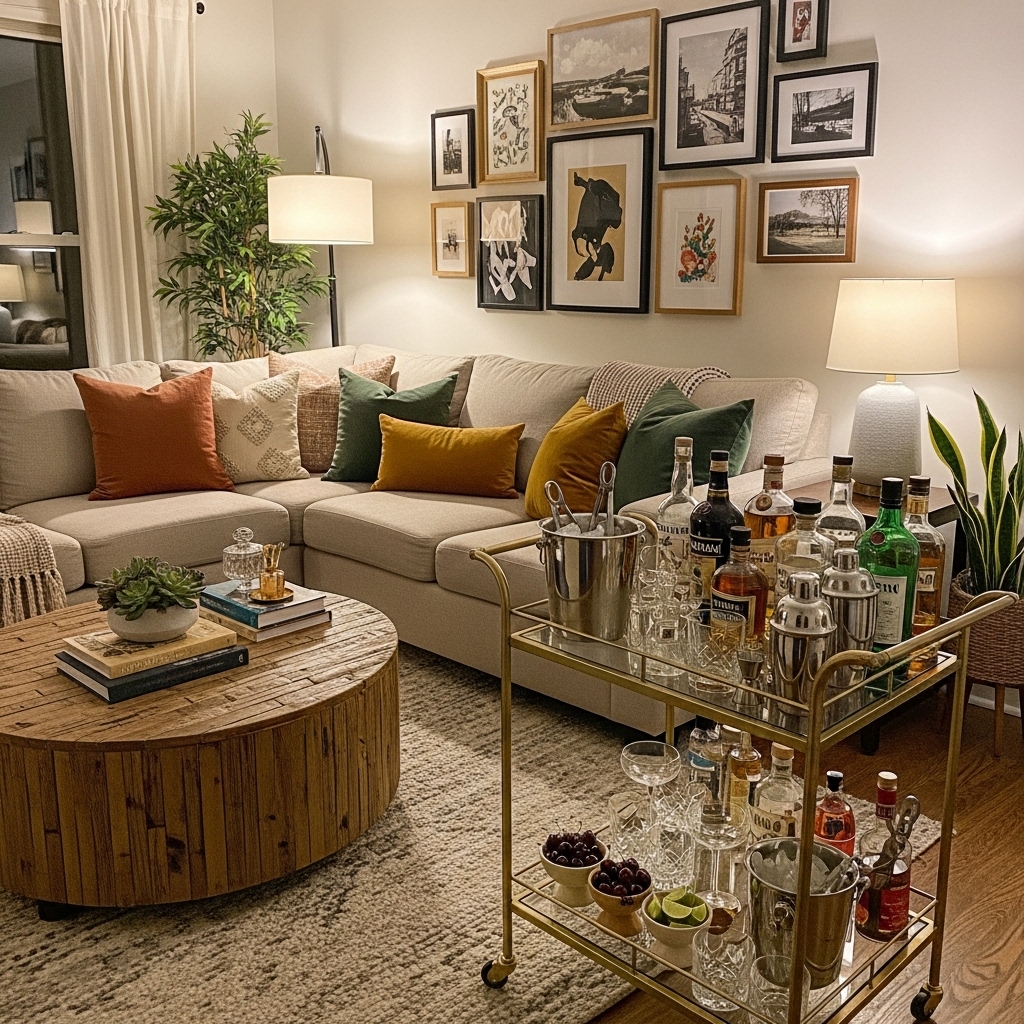 Roll a bar cart into the living room for parties. Stock it with glasses, bottles, and a shaker. Roll it back to the kitchen when done.