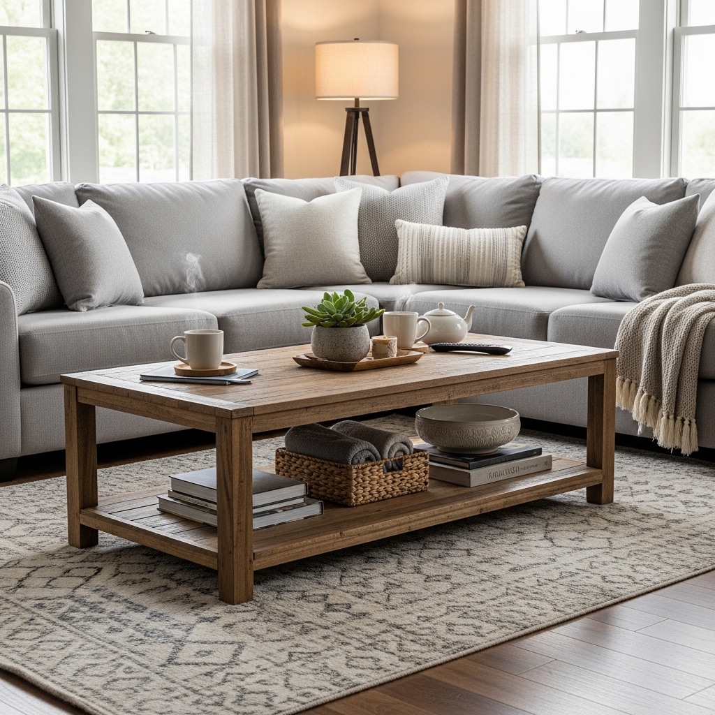 A coffee table with a lower shelf adds storage without adding bulk.