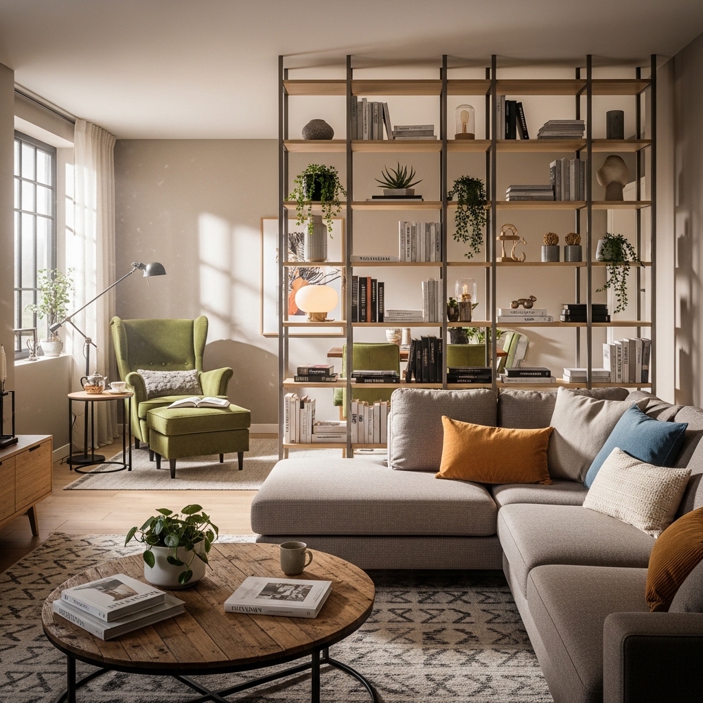 Open floor plans need definition. A low bookshelf divides the space without blocking light.
