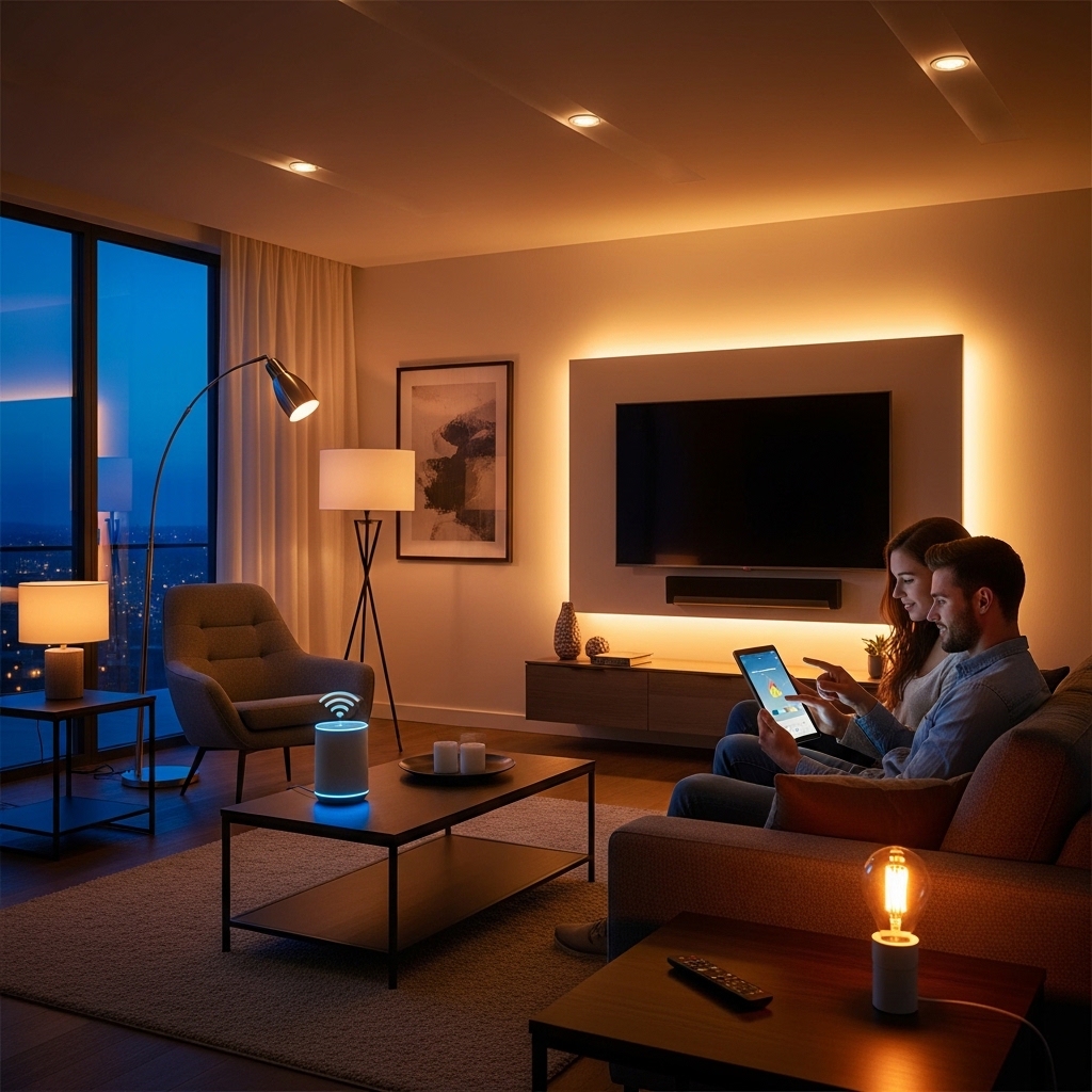 Smart lighting allows control of brightness and color through apps or voice commands.