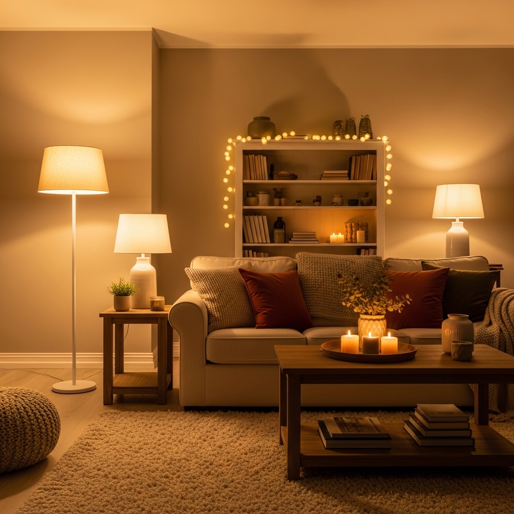 How to apply: Replace cool white bulbs with warm ones in lamps and ceiling fixtures. Keep consistency across all lights.