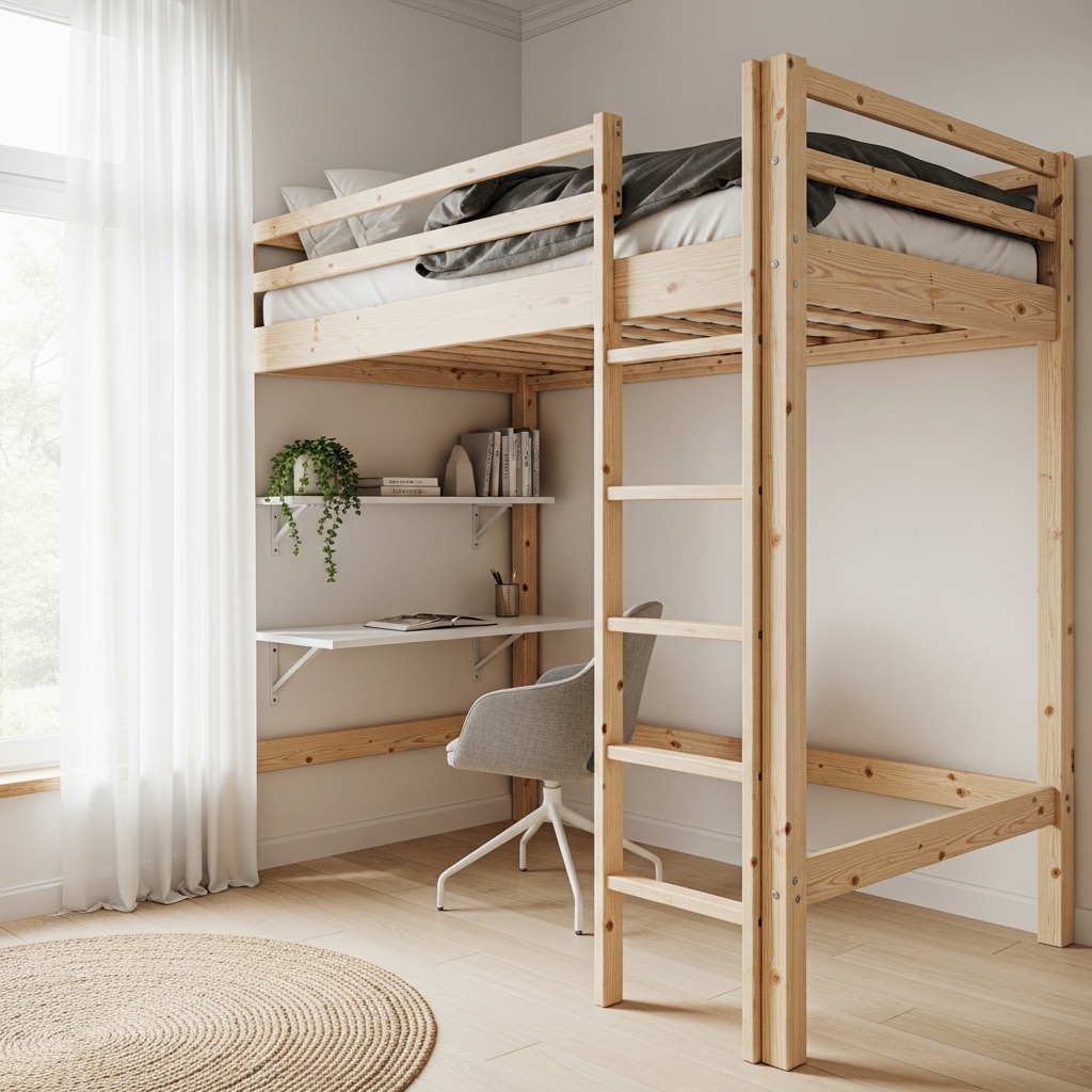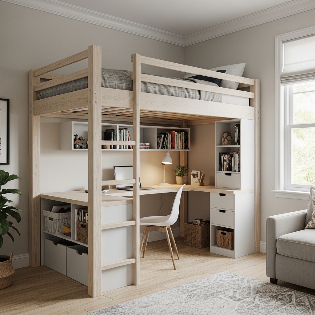 A loft bed with a built-in desk is one of the most efficient ways to combine sleeping and workspace in a small room. The area underneath becomes a fully functional study or work zone without taking up extra space.
