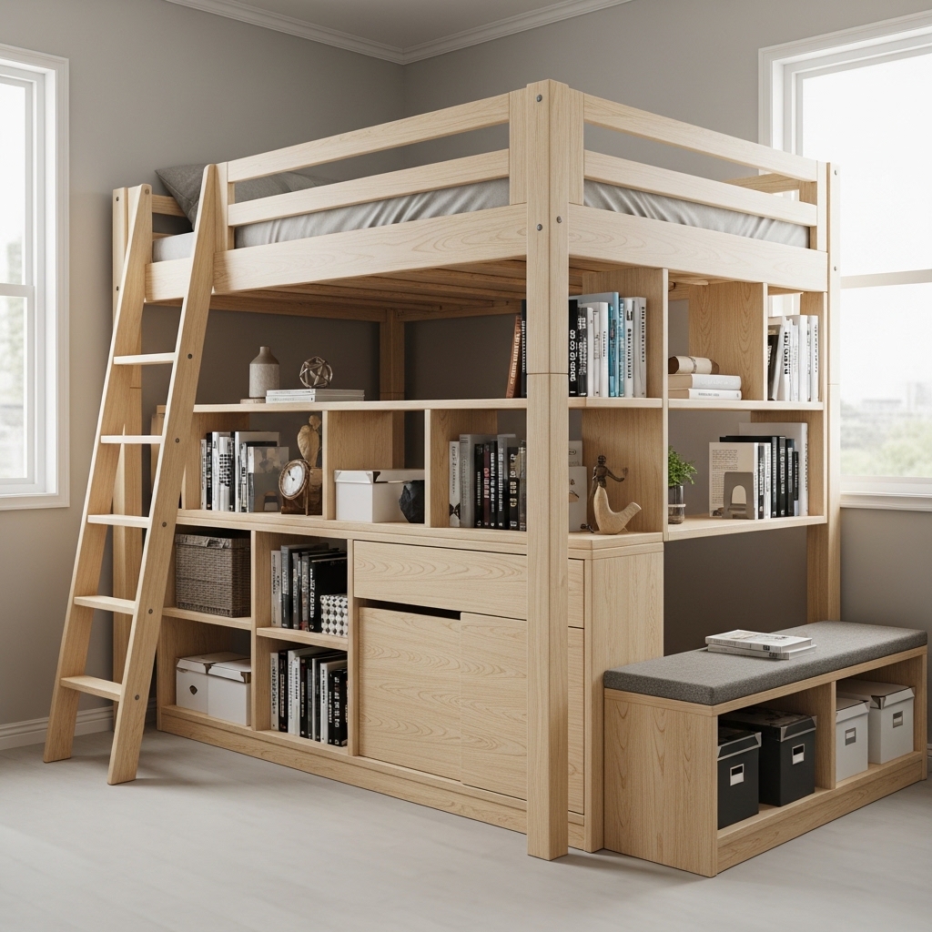 Adding built-in bookshelves to a loft bed structure enhances both storage and design. Shelves can be placed on the sides or underneath the bed.