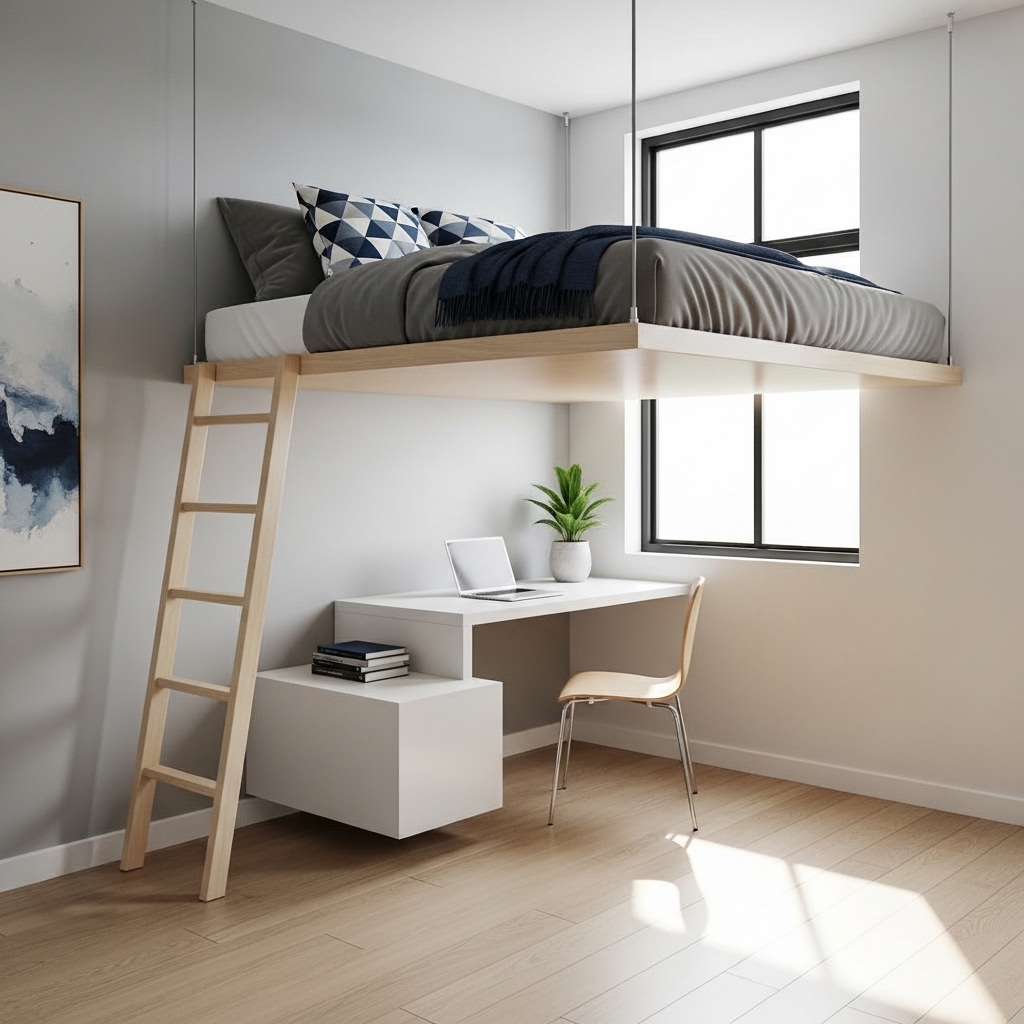 A floating loft bed mounted to the wall creates a sleek and modern aesthetic. It gives the illusion of more space by keeping the floor area completely open.
