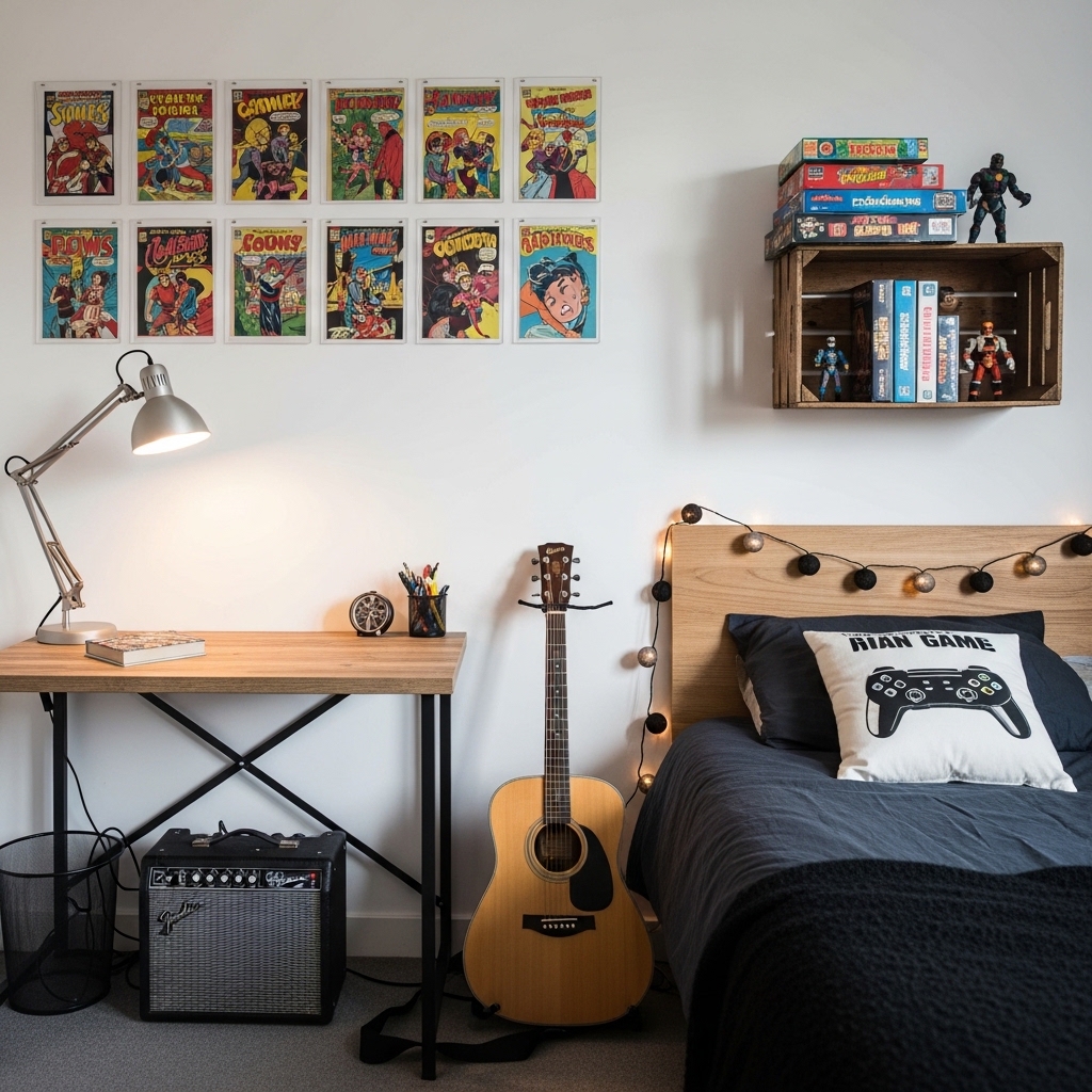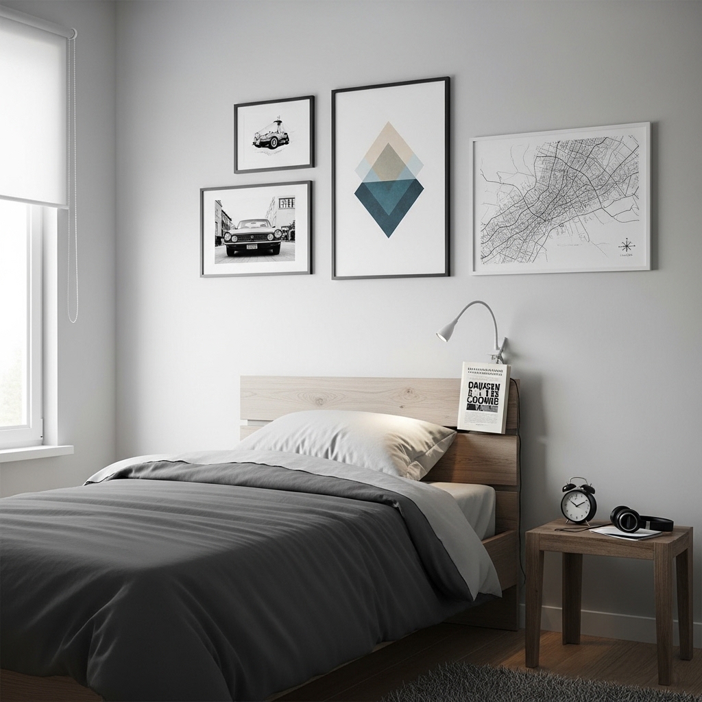 Wall art is one of the easiest ways to add personality to a male bedroom. Posters, black-and-white photos, or motivational prints can transform plain walls.