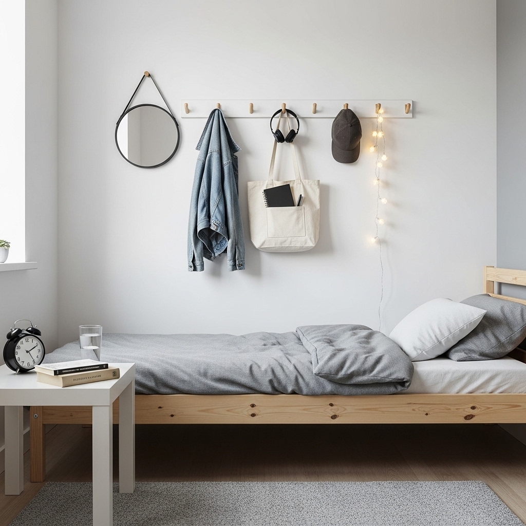 Wall hooks are an inexpensive way to keep clothing, bags, and accessories organized.