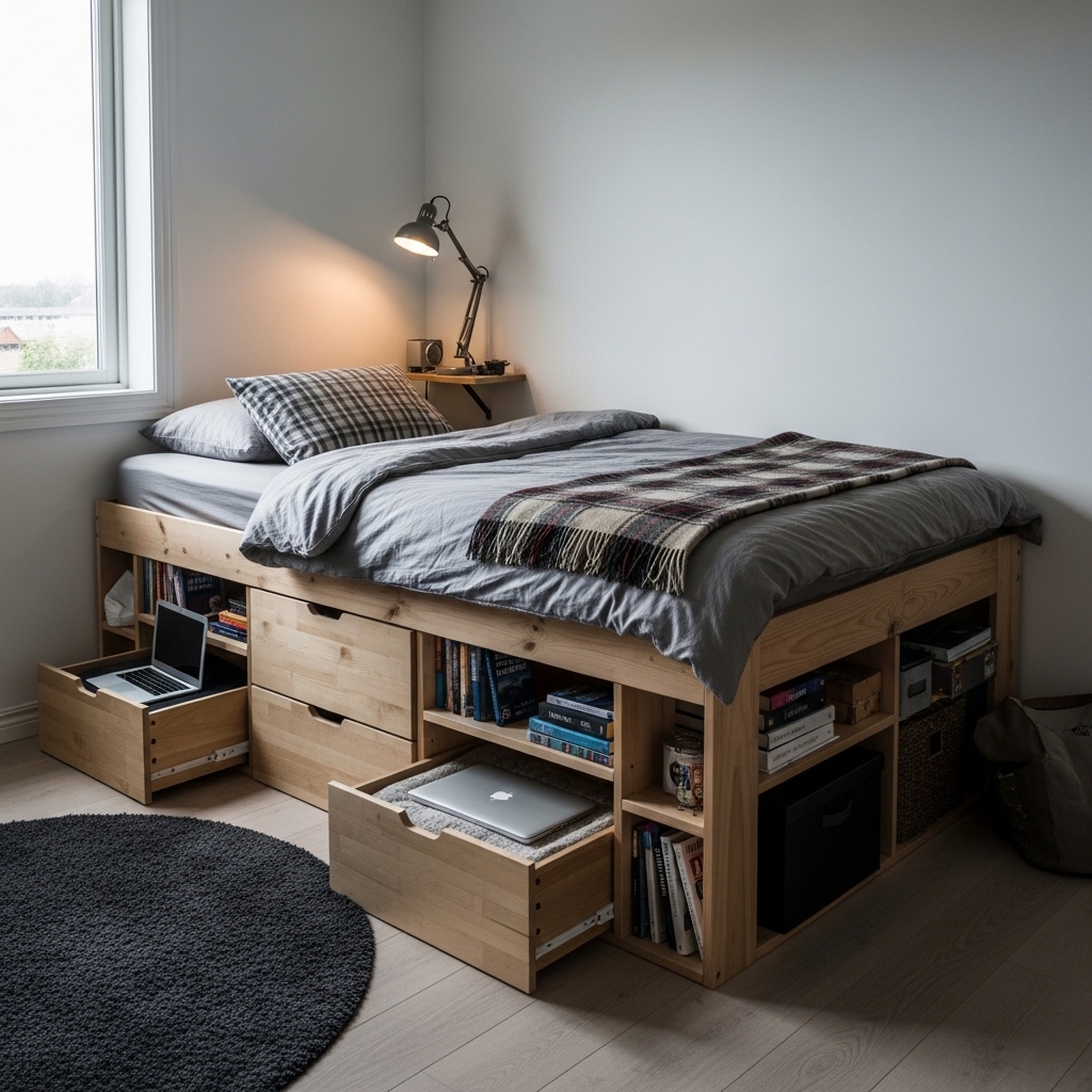 Under-bed storage is perfect for small bedrooms. Storage boxes or drawers can hold seasonal clothing, shoes, or extra bedding.
