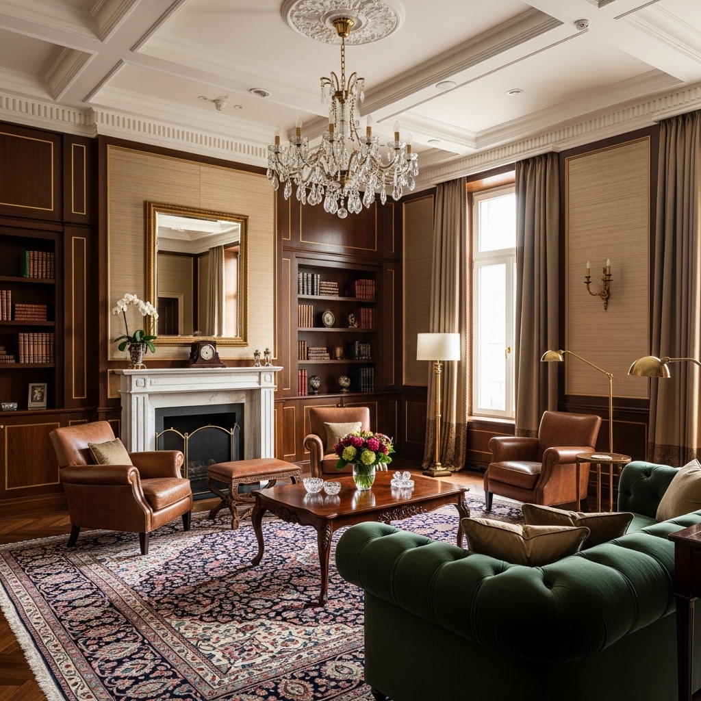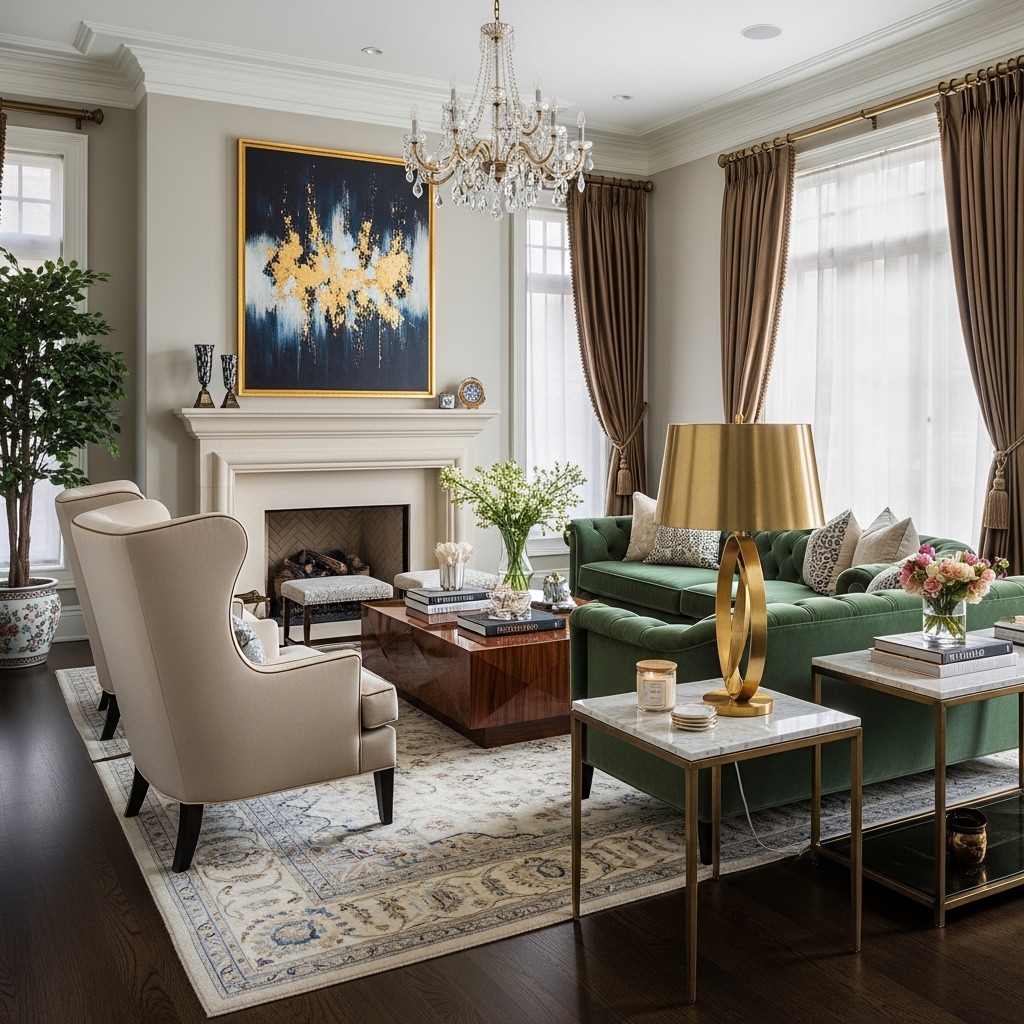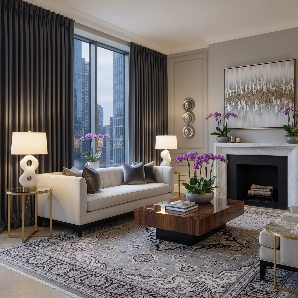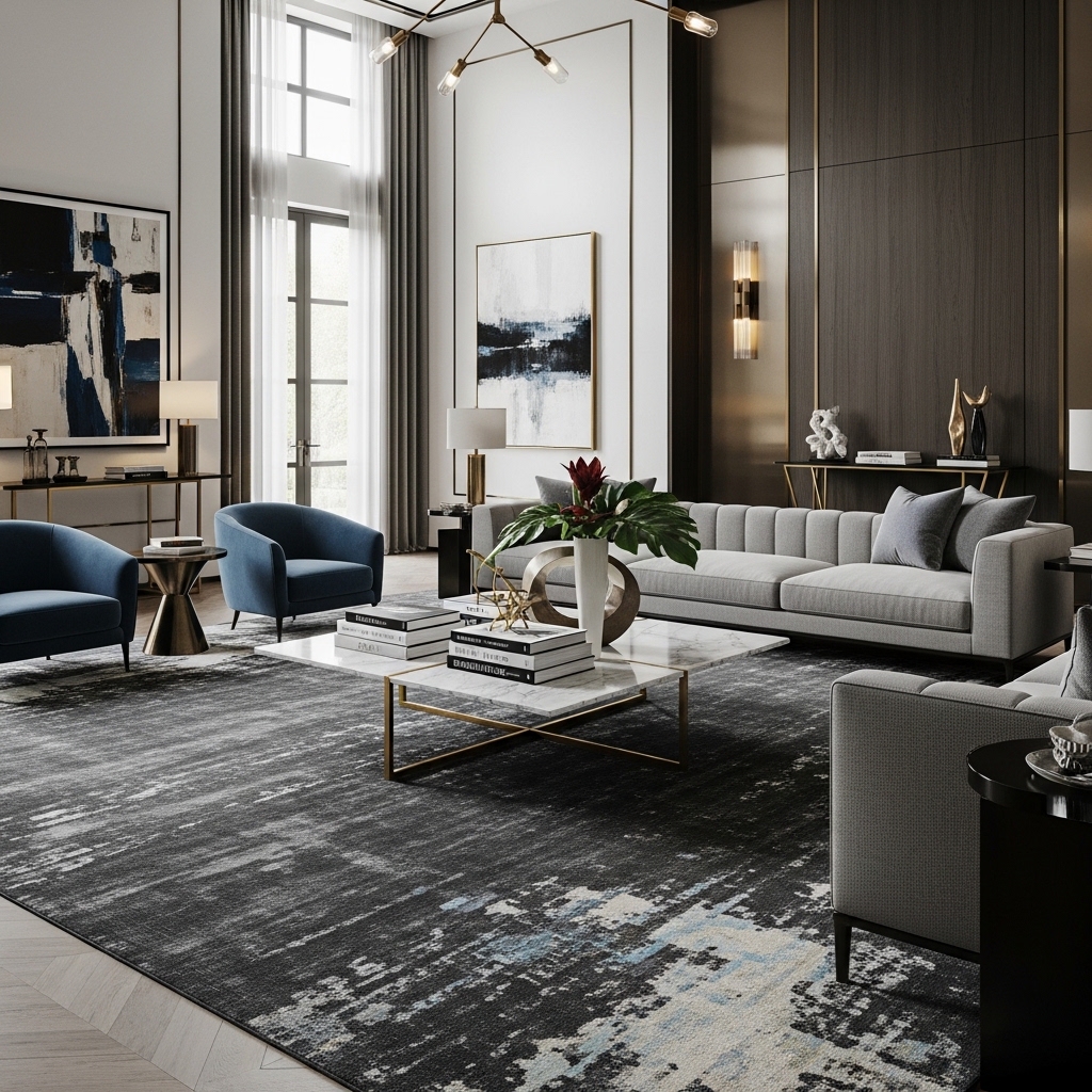 In luxury living room decor, rugs often feature subtle patterns or rich textures rather than loud designs.
