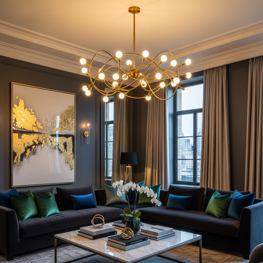 A chandelier or sculptural pendant acts as a focal point and elevates the room instantly. It draws the eye upward and adds architectural interest.