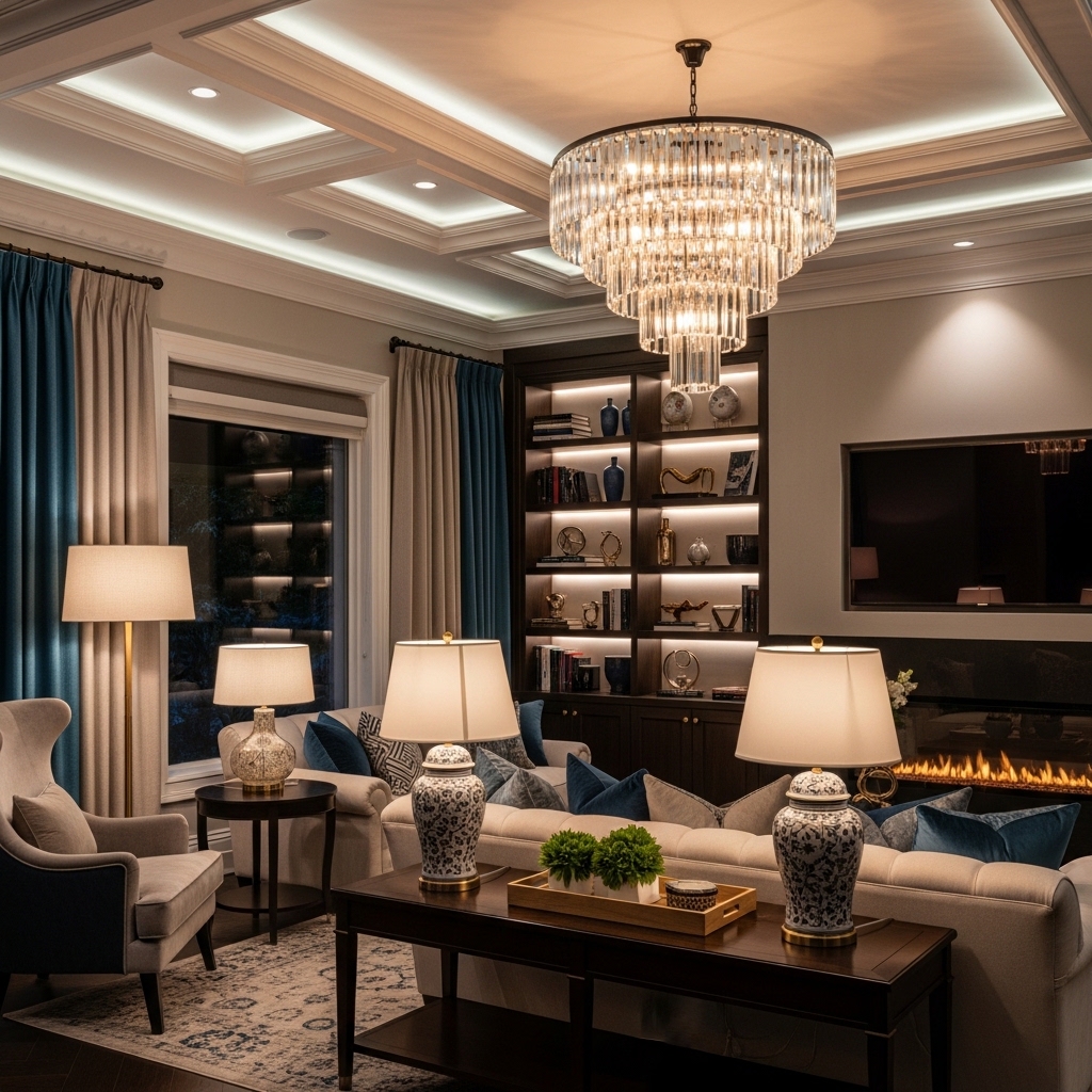 Layered lighting highlights textures, defines zones, and enhances ambiance—key in high-end living room lighting design.