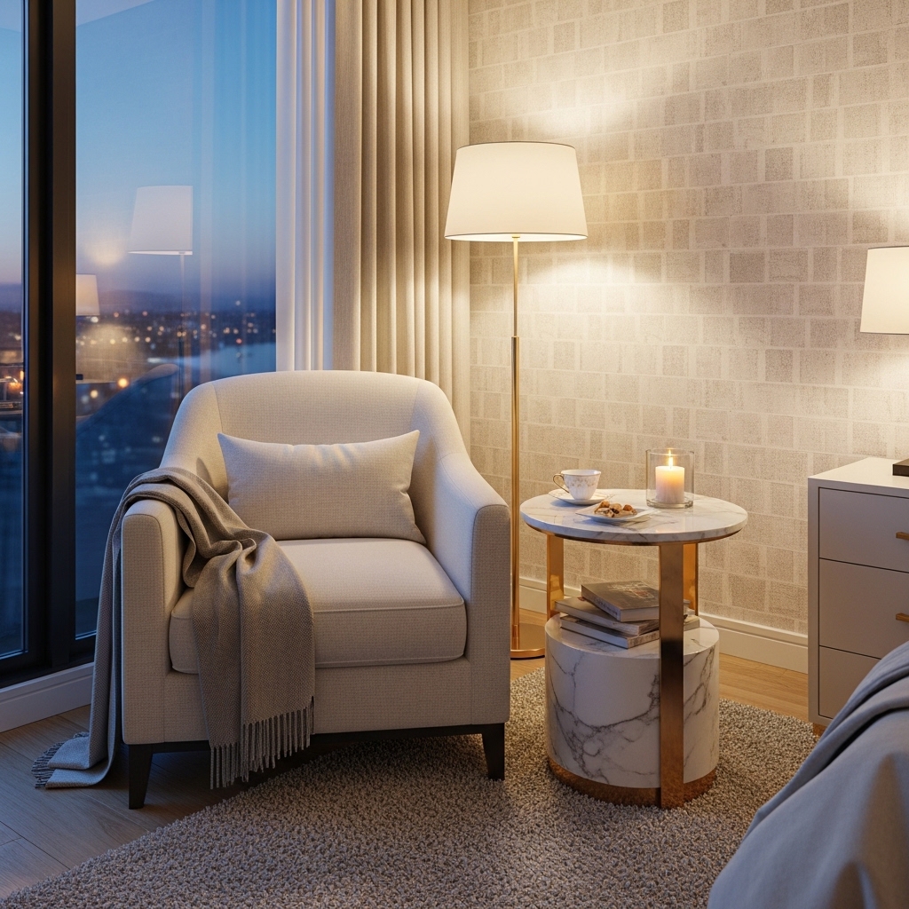 Positioning the seating near a window or corner can make the bedroom feel more spacious and balanced.