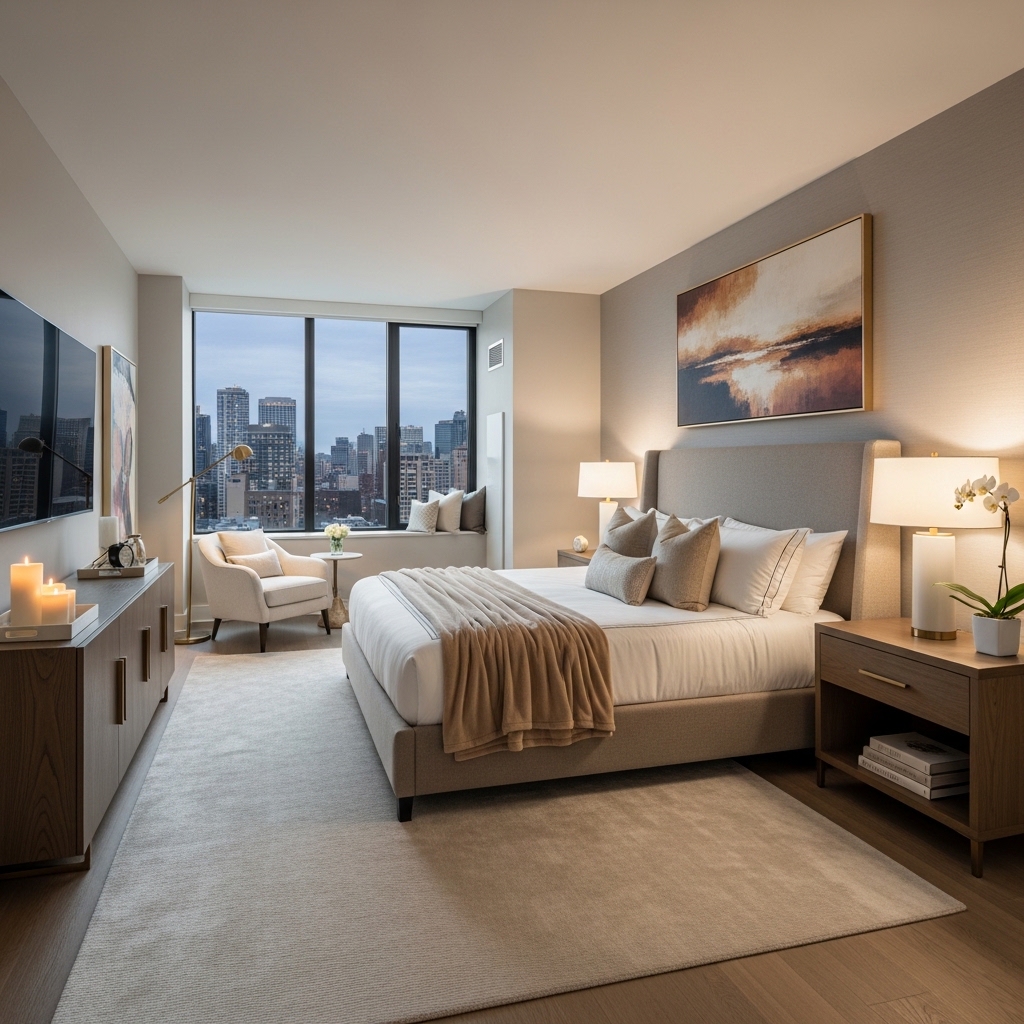 A luxury master bedroom often includes a small seating area to create a more functional living space. Adding an accent chair, chaise lounge, or small bench allows the room to feel more like a private suite rather than just a sleeping area.