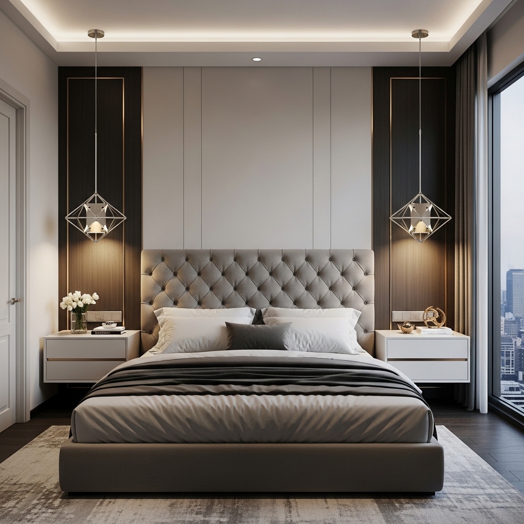 Lighting is a key element in luxury bedroom design. Instead of traditional table lamps, modern master bedrooms often feature pendant lights hanging beside the bed. These sleek lighting fixtures create a contemporary aesthetic while freeing up space on the nightstand.