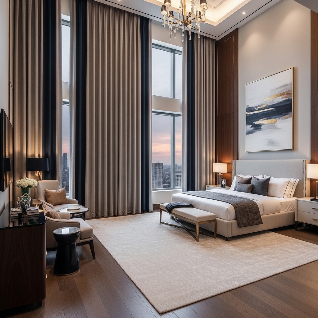 Long, flowing curtains are a signature feature of luxury master bedroom interiors. Floor-to-ceiling curtains make the room appear taller and more elegant while softening the overall design.