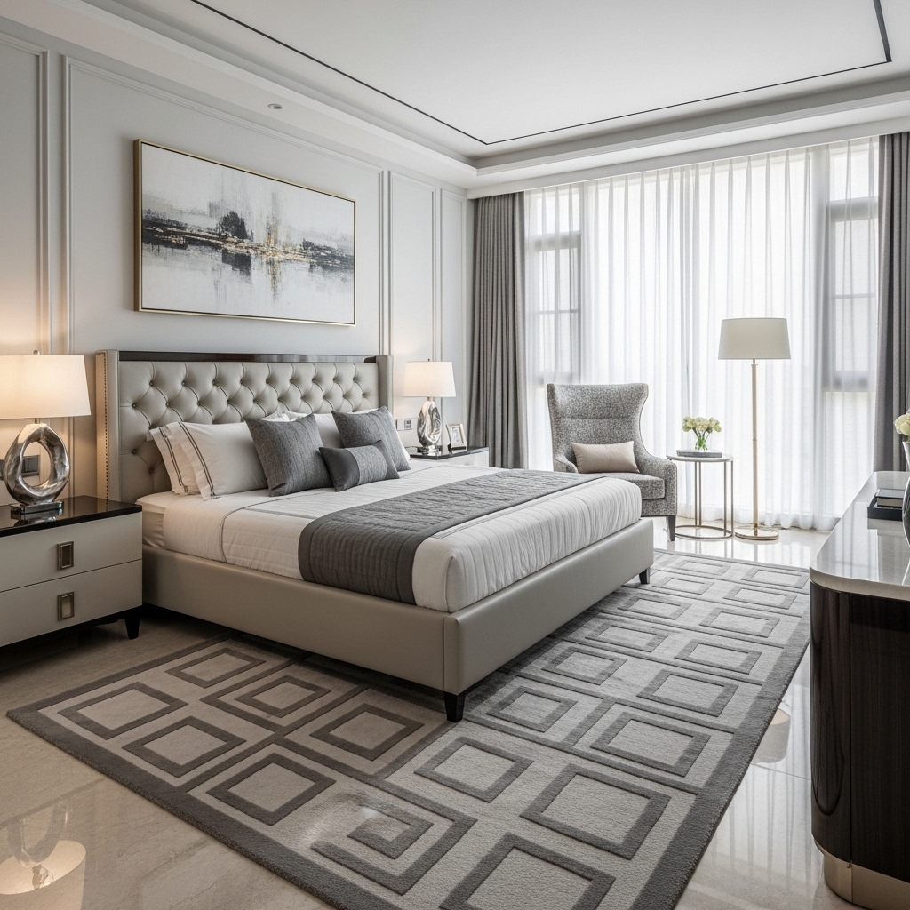 A large area rug helps define the sleeping area while adding warmth and softness to the bedroom. Luxury master bedrooms often feature oversized rugs that extend beyond the bed to frame the furniture arrangement.
