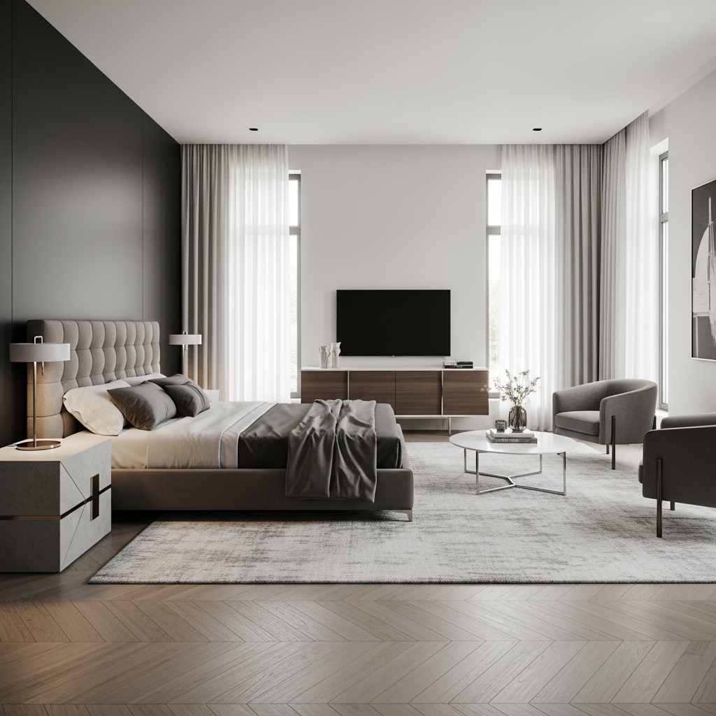 A minimalist layout keeps the room feeling spacious, calm, and visually balanced. Clean lines and simple furniture silhouettes contribute to the overall modern aesthetic.
