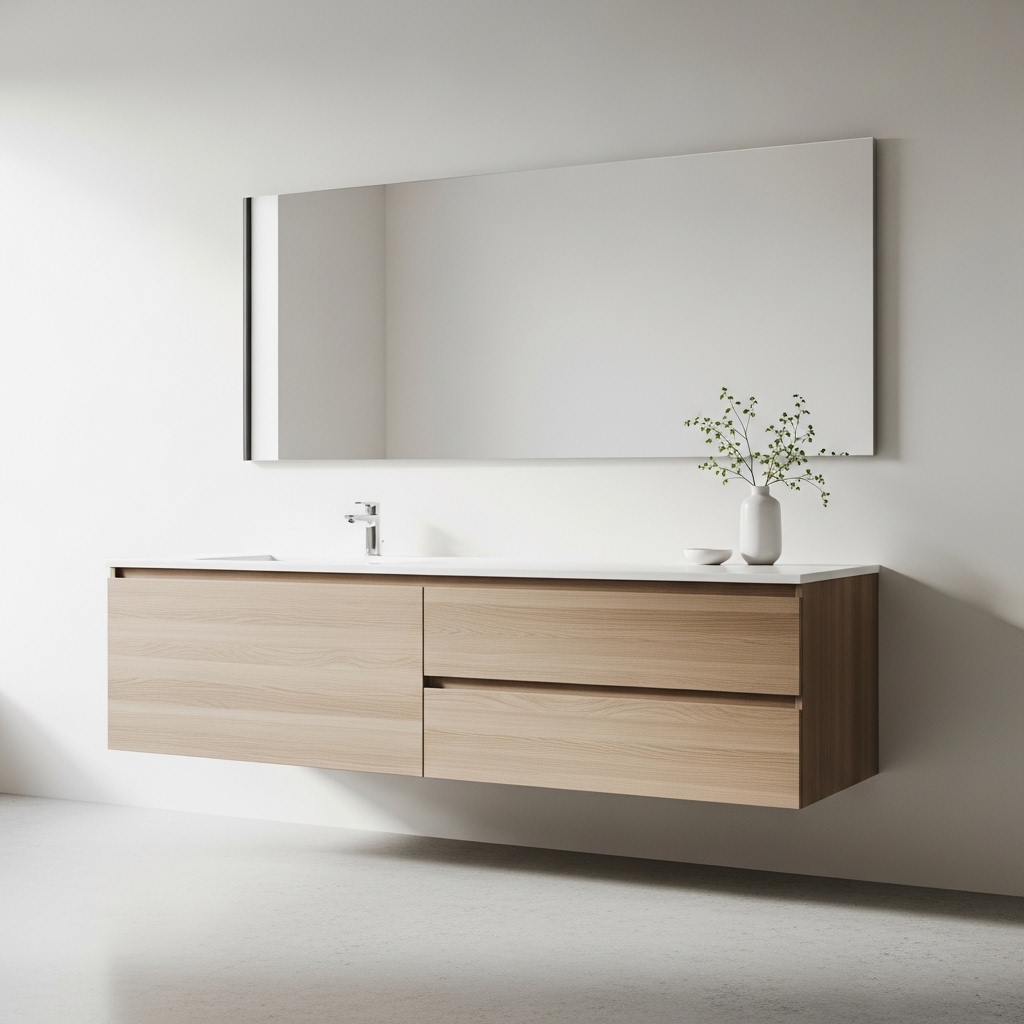 A floating vanity creates visible floor space, making the room feel more open. Keep the area underneath empty rather than filling it with baskets or bins.