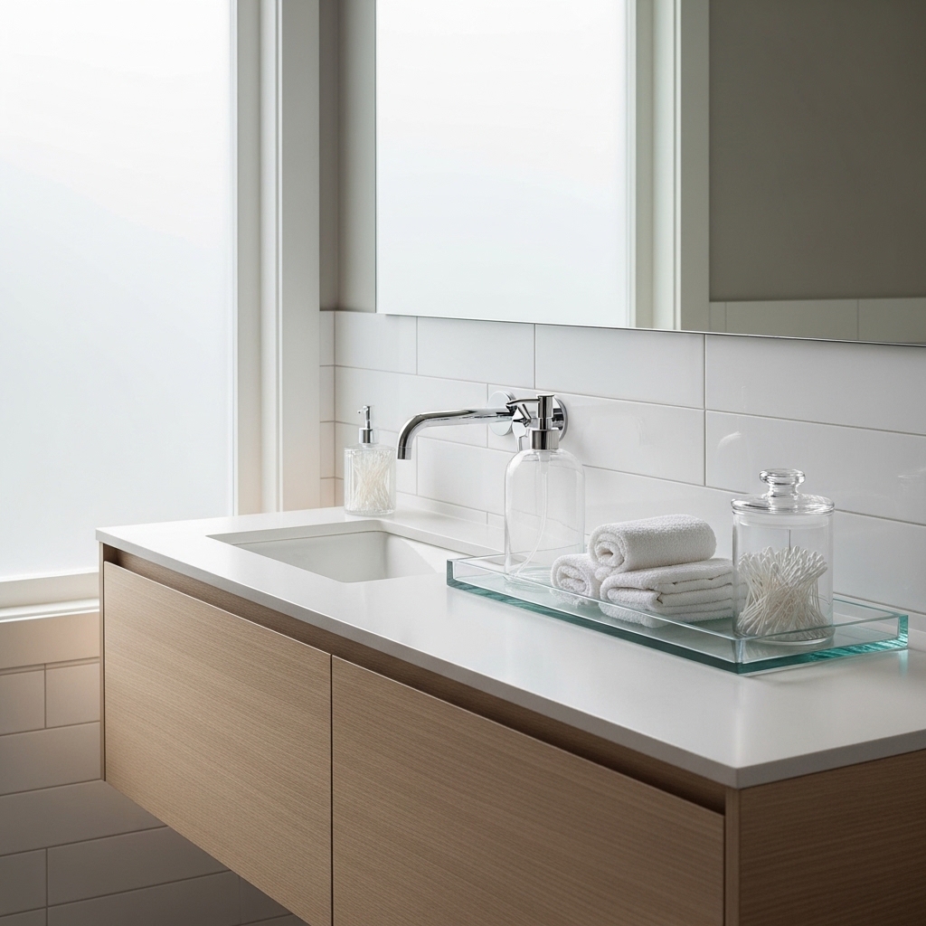 Use vanities with internal compartments or mirrored cabinets to store daily items out of sight. Only keep essentials visible.
