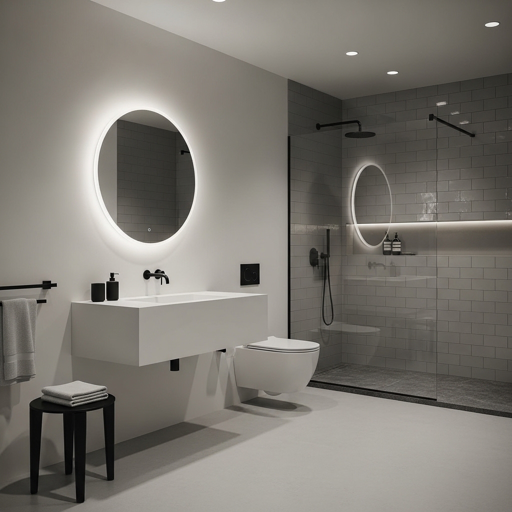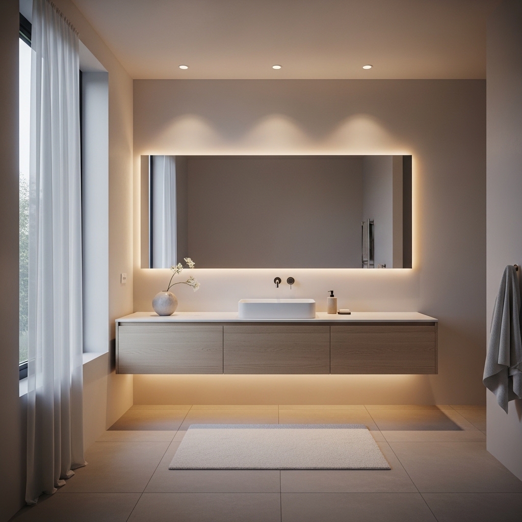 Use warm lighting around mirrors and reduce reliance on ceiling lights. Layer lighting carefully.