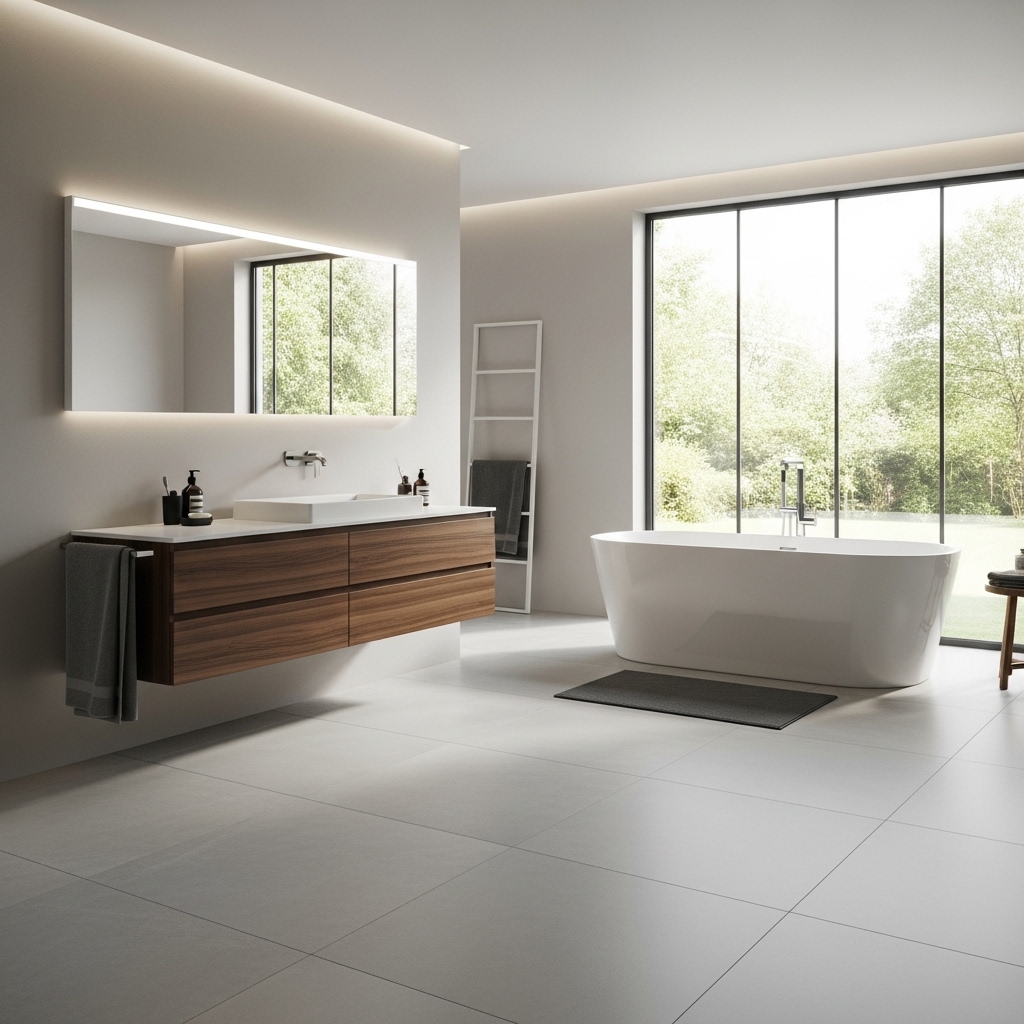 Large tiles reduce grout lines, making the floor look smoother and easier to maintain. Use consistent grout color to keep the surface visually continuous.