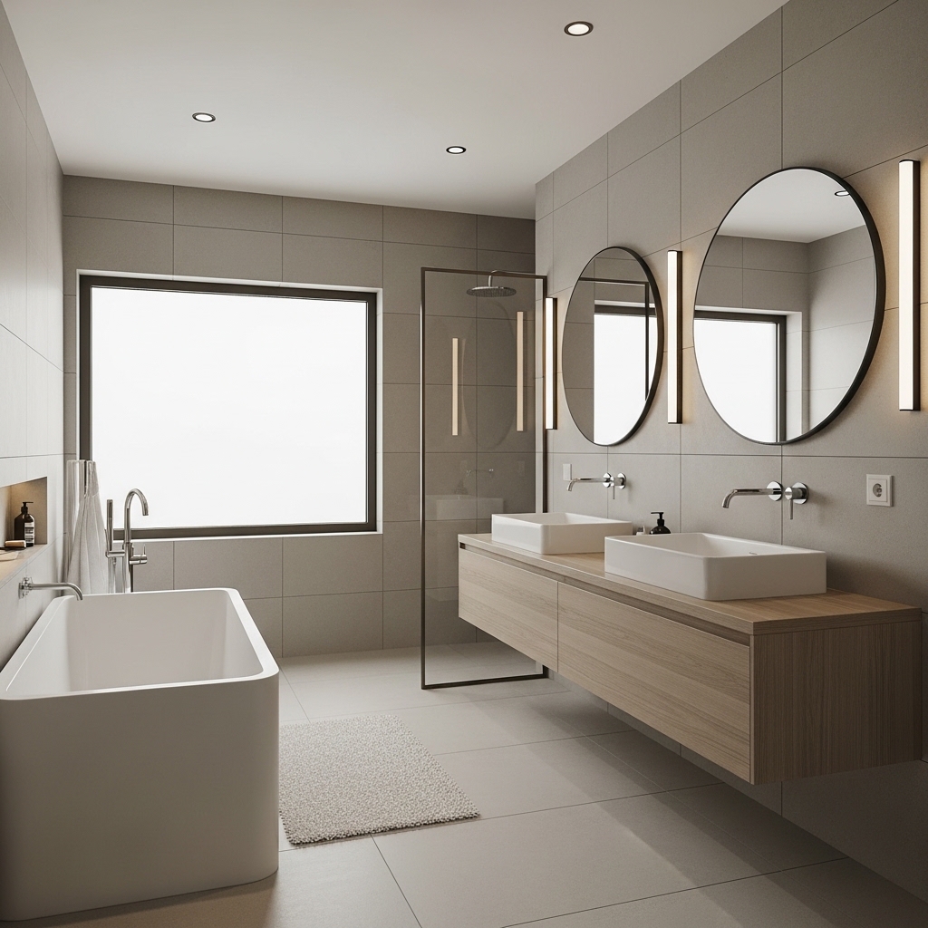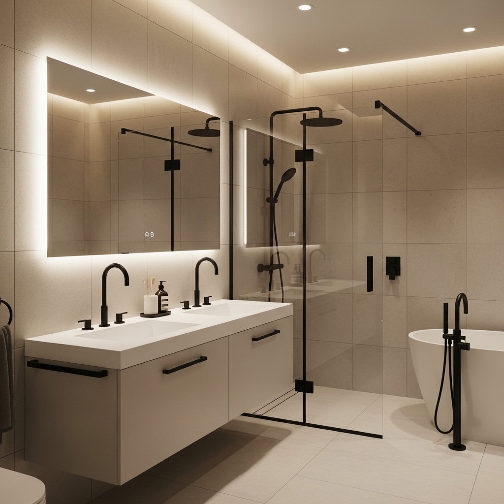 Warm lighting softens hard surfaces and makes the space more comfortable for daily use. Layer lighting across ceiling and mirror areas.