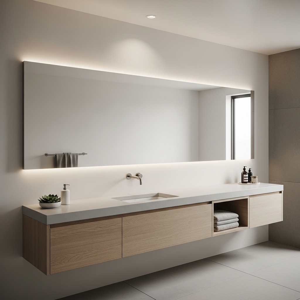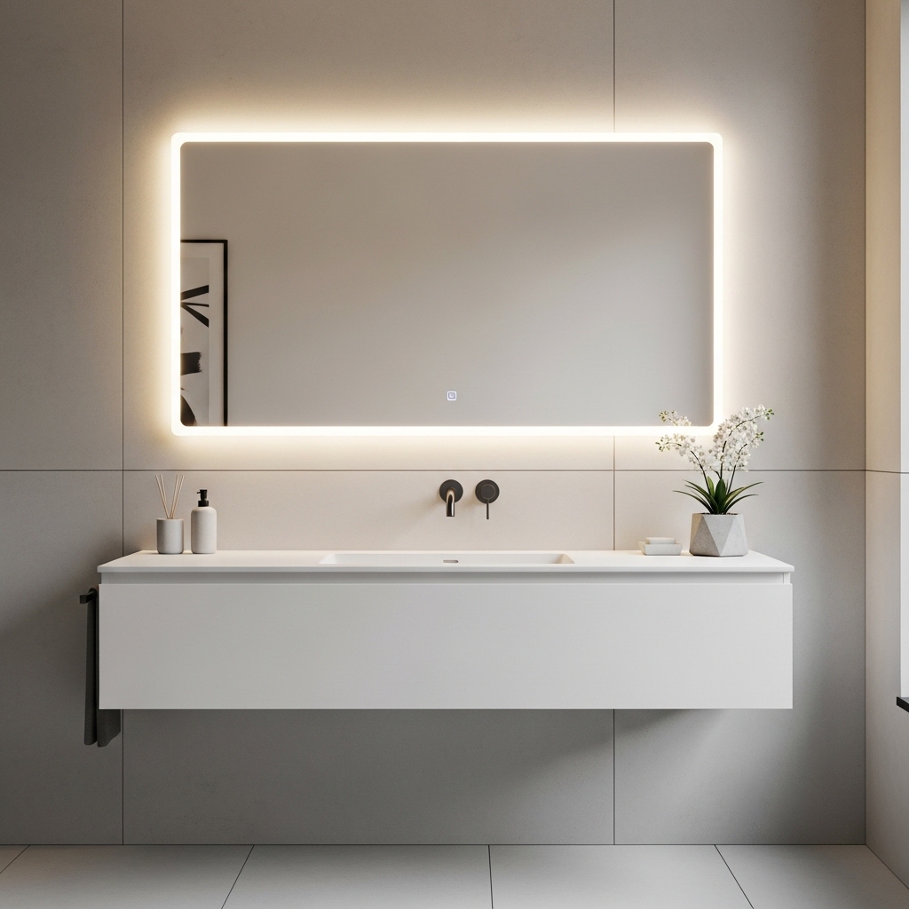 A backlit mirror provides even lighting at eye level, improving visibility for grooming. Choose a warm light tone for comfort.
