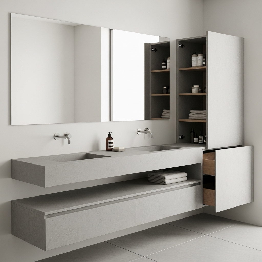Use vanities with internal organizers or mirrored cabinets to store daily items out of sight. Keep only essentials on the surface.