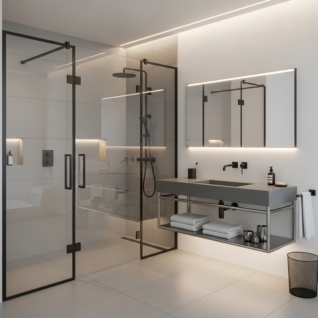 Combine glass elements like shower panels with metal fixtures in a consistent finish. Keep the palette simple.