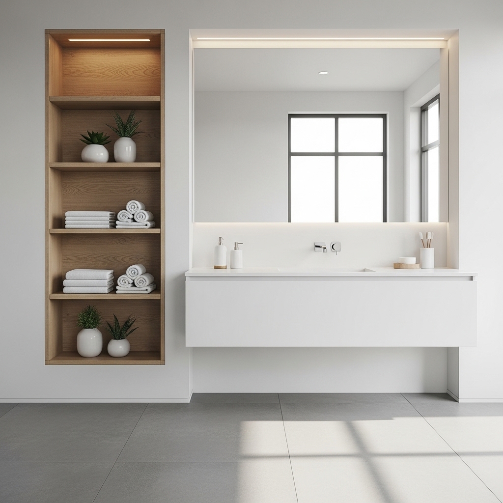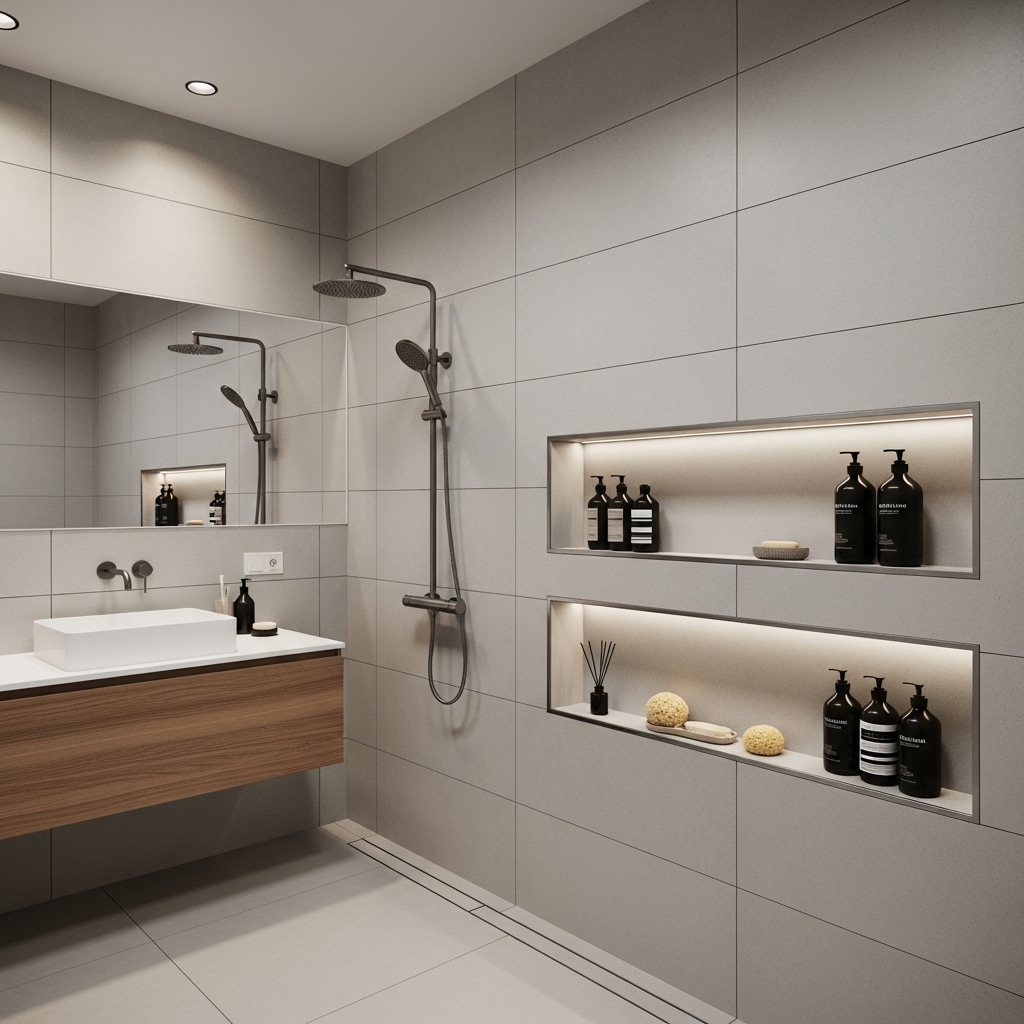 A recessed niche keeps essentials within reach without adding external shelves. Position it at chest height for easy daily use.