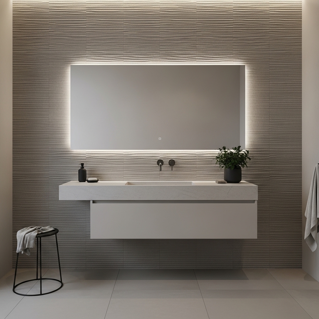 A single textured wall adds depth without requiring extra decor. Use it behind the vanity or in the shower area.