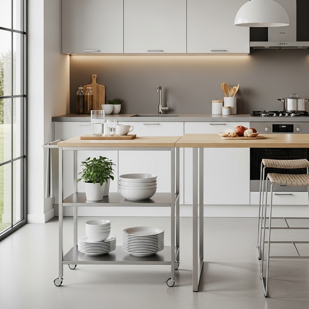 Choose a cart with a butcher block top and locking casters. Roll it where you need it. Lock the wheels to keep it stable.