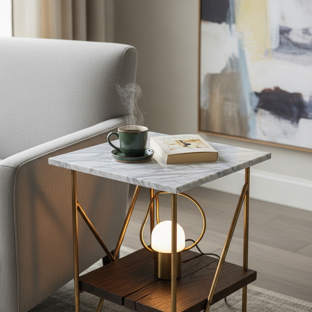 Choose a side table with a marble top and a metal base. The marble should be white or gray. The base should be simple.