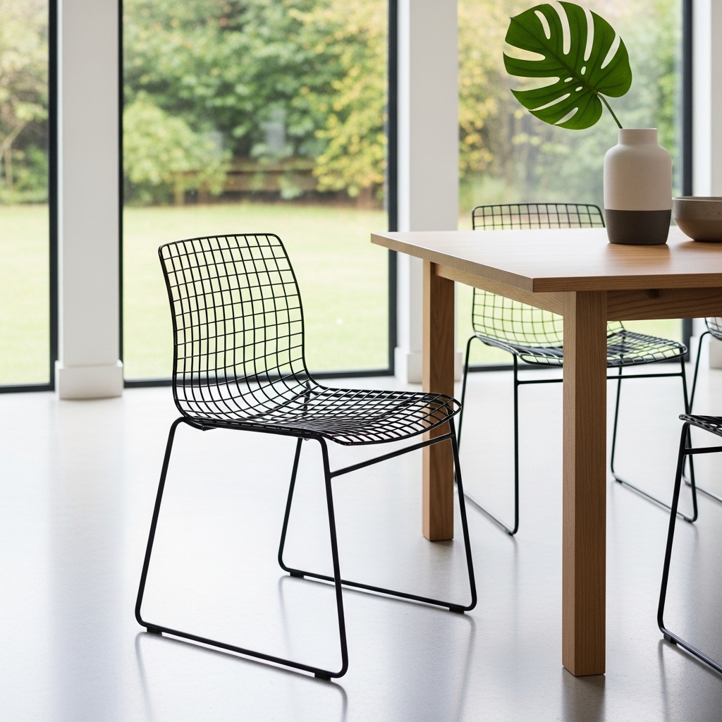 Wire chairs are modern. They are durable. They are comfortable with a cushion.