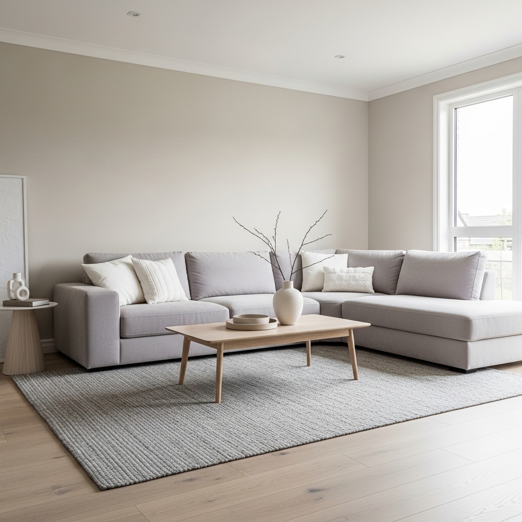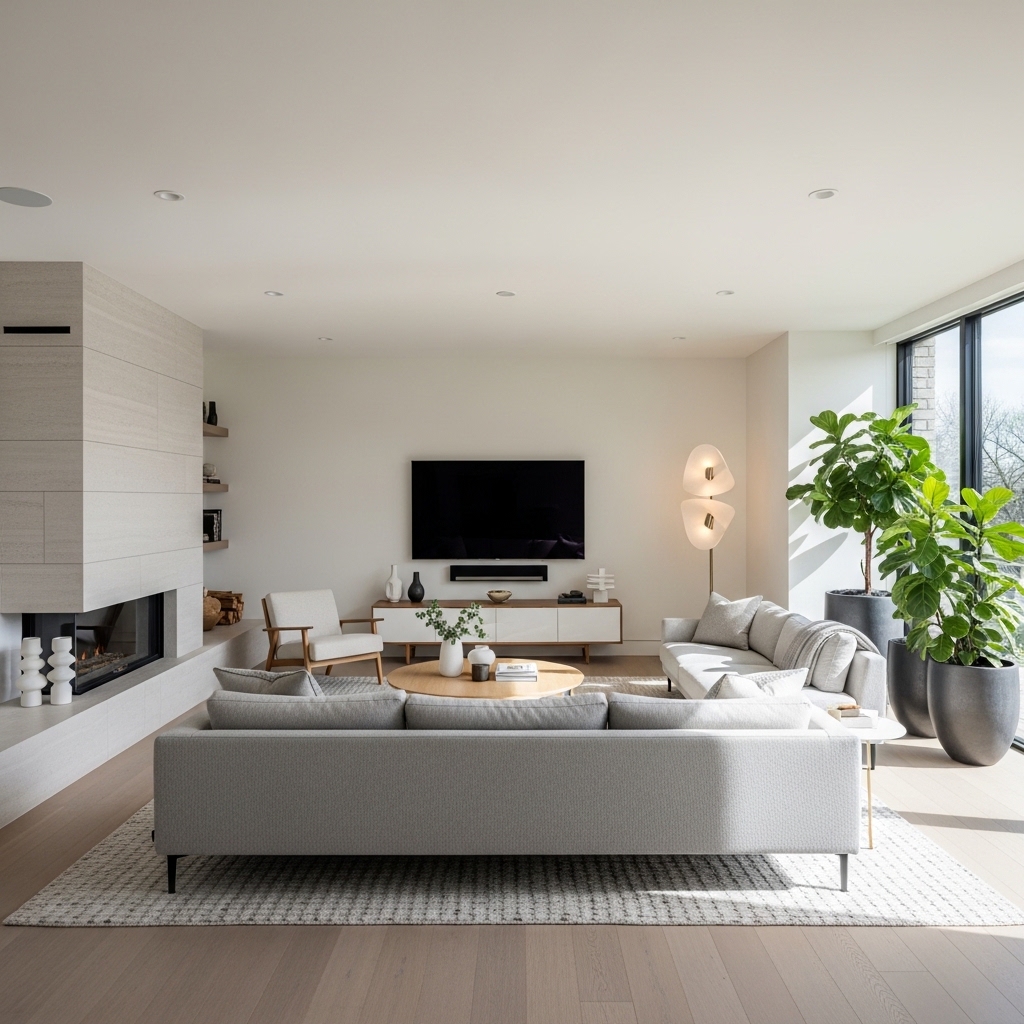A large rug defines your seating area and prevents the room from feeling disconnected. It also adds warmth and texture—essential for balancing modern minimalism.