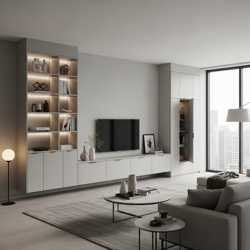 Clutter breaks the modern aesthetic instantly. Built-in cabinets, hidden storage, or sleek media units keep everything organized.