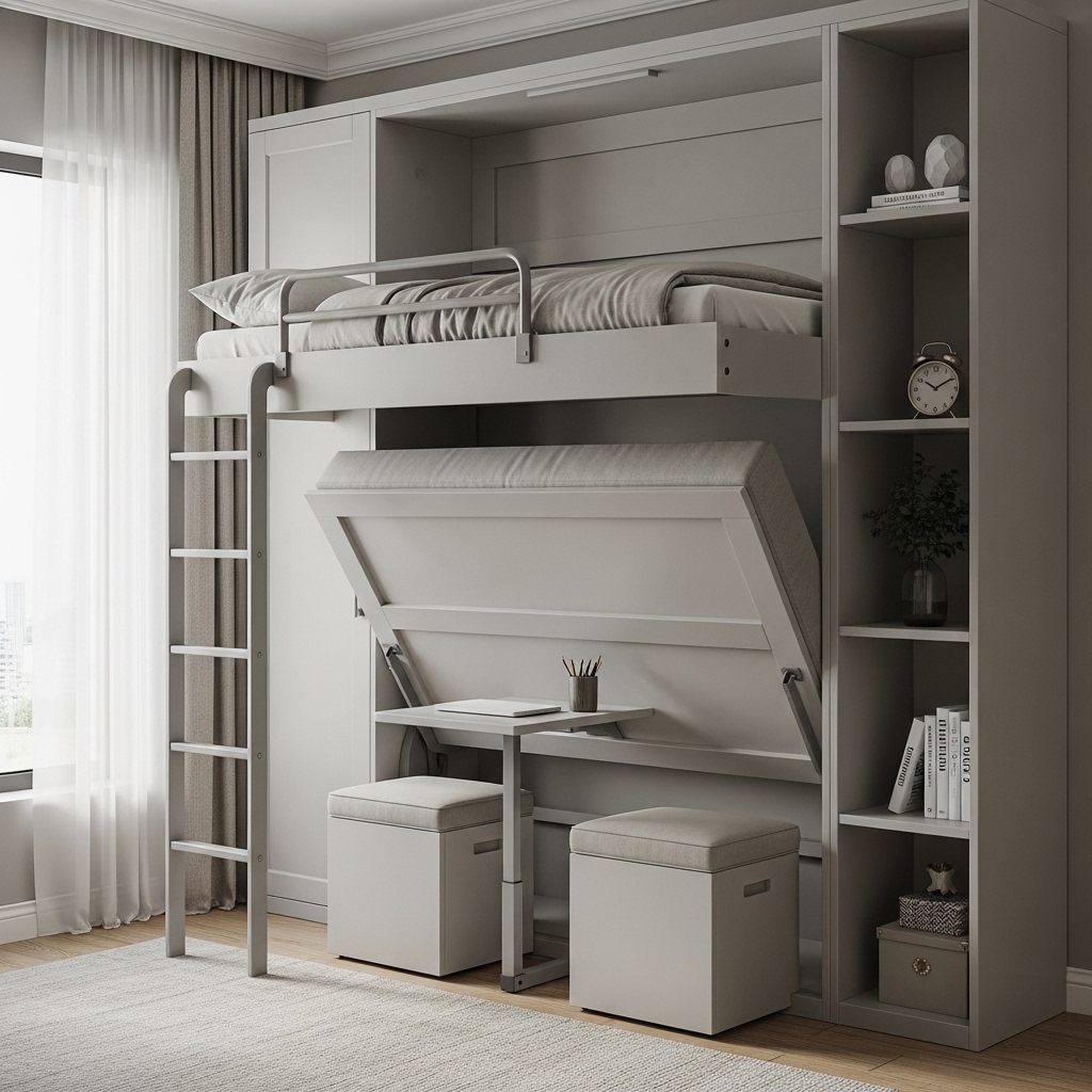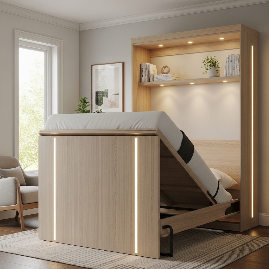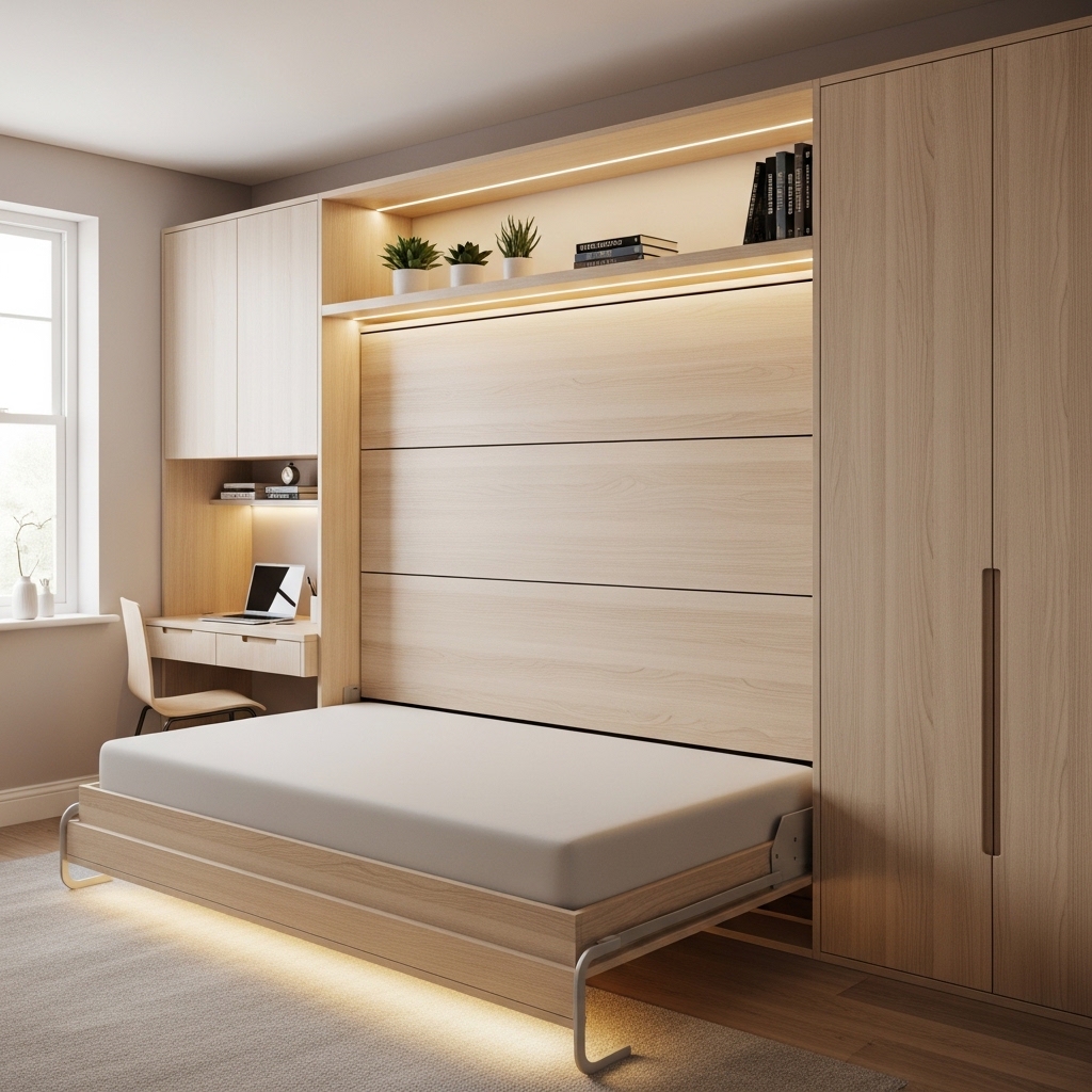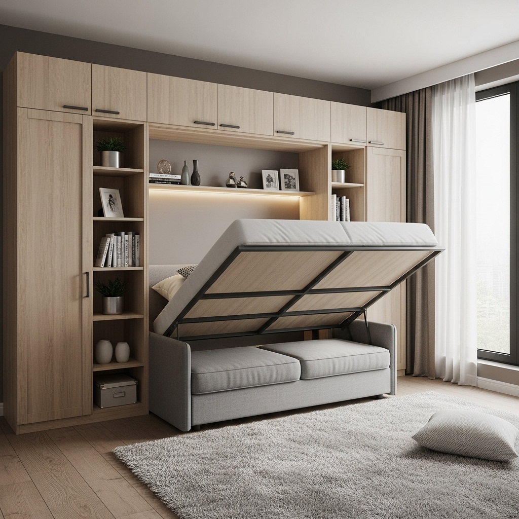 A Murphy bed integrated with storage cabinets is a complete space-saving solution. When folded up, it blends seamlessly into a wall unit while providing shelves and compartments for storage.