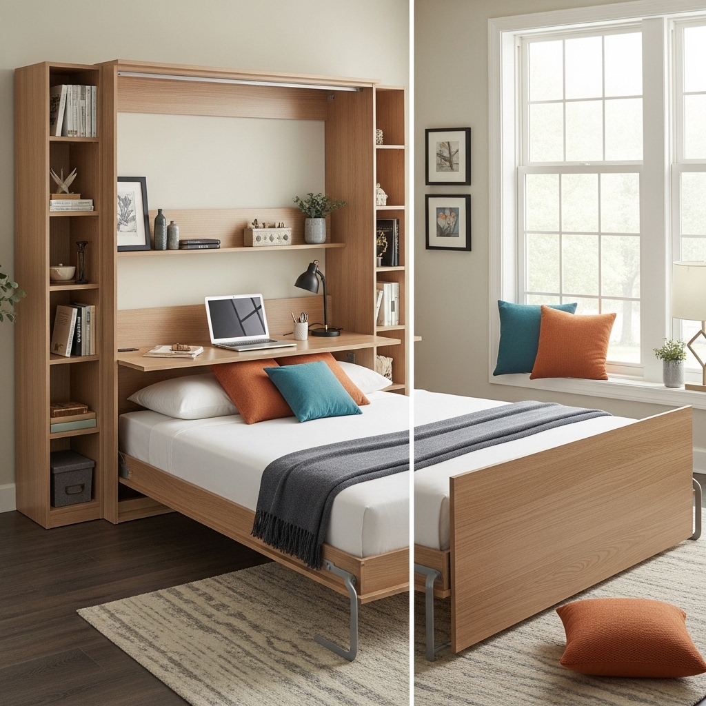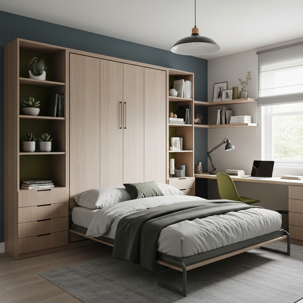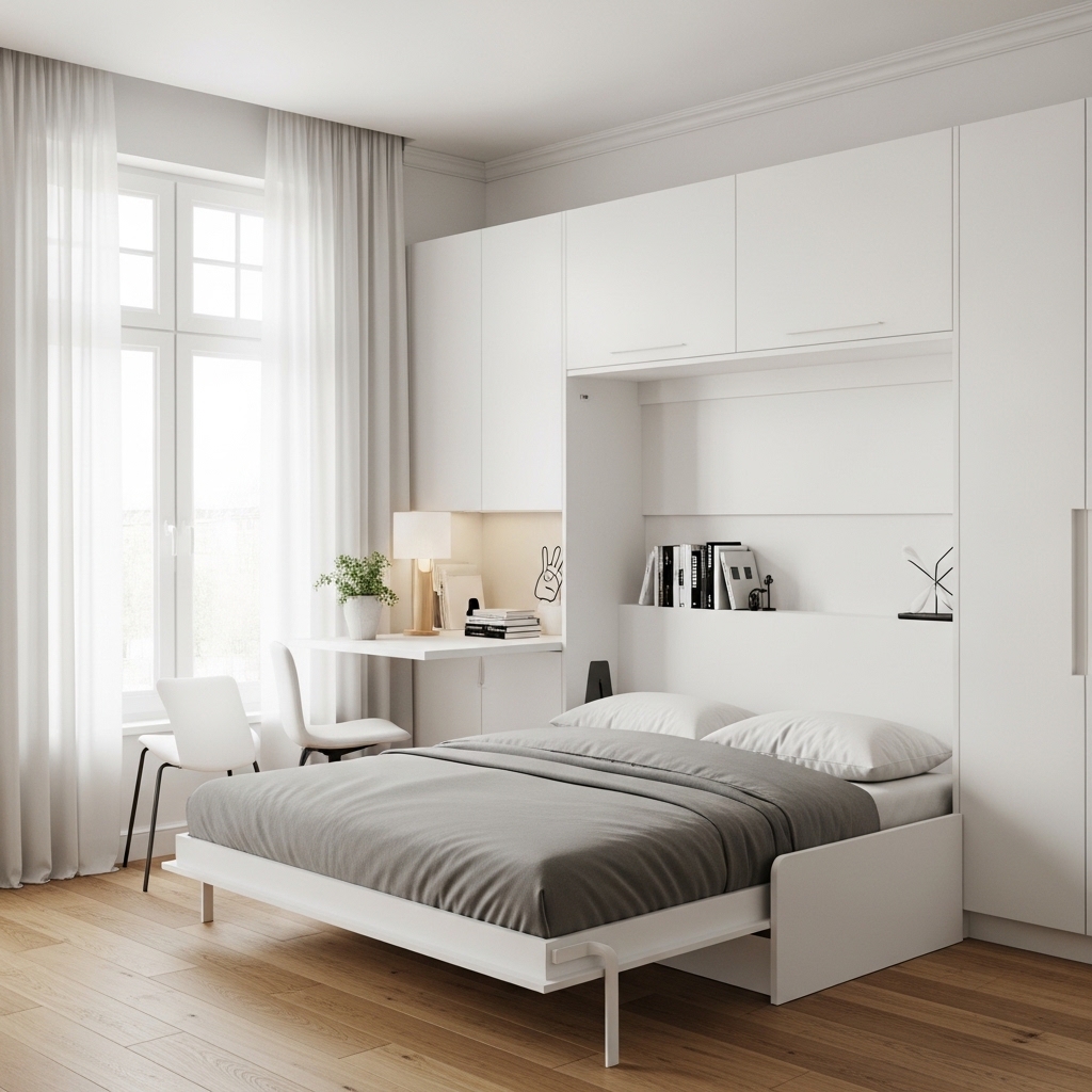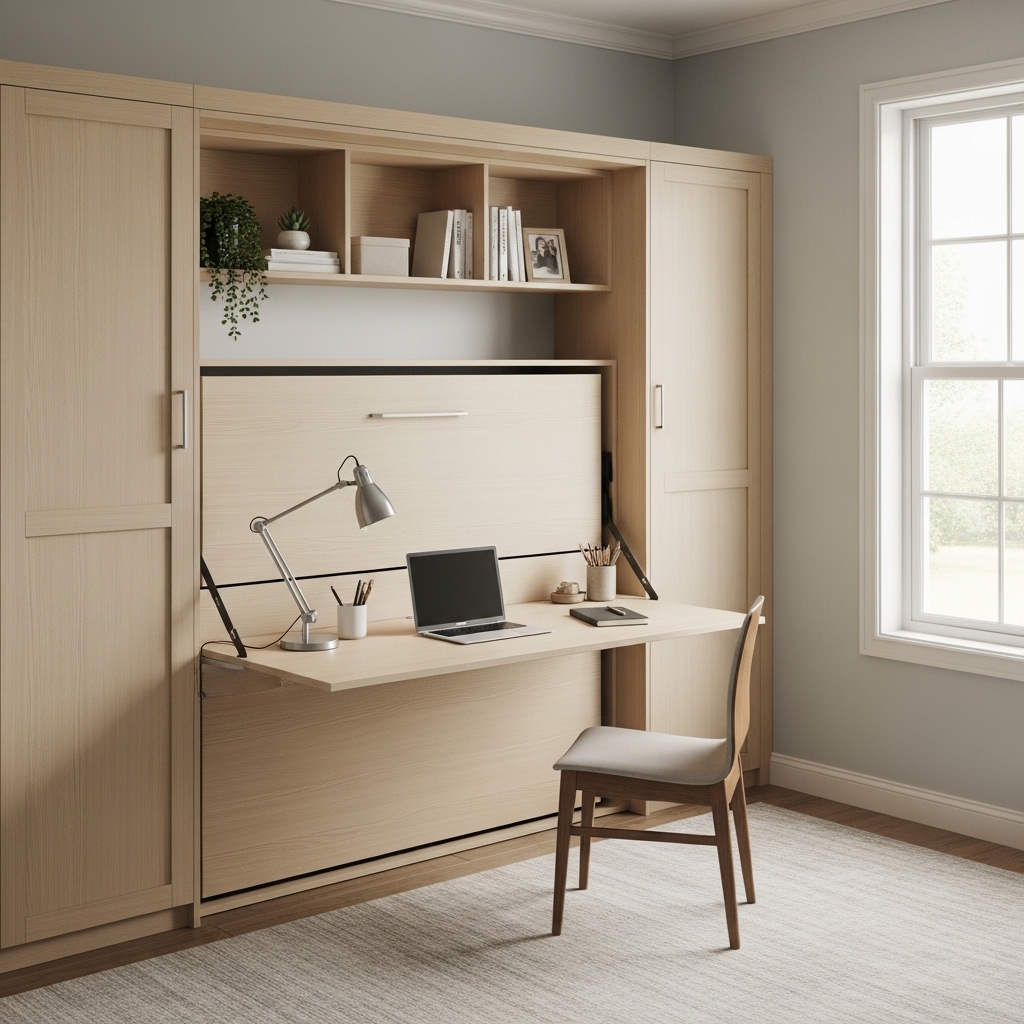 A Murphy bed with a fold-down desk is ideal for creating a workspace in a small bedroom. The desk remains functional even when the bed is stored.