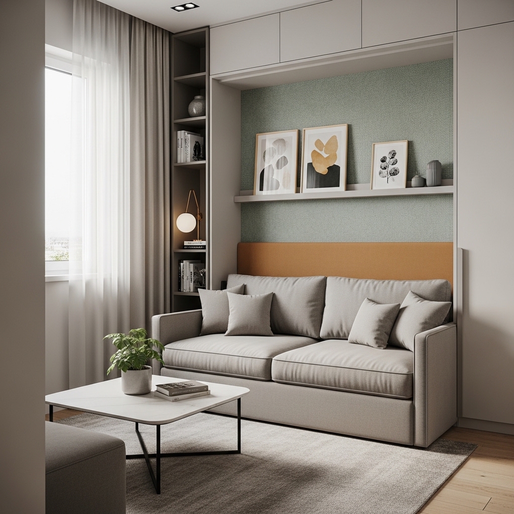 A Murphy bed with a built-in sofa allows your bedroom to function as a living space during the day. When the bed is folded up, the sofa becomes the main seating area.