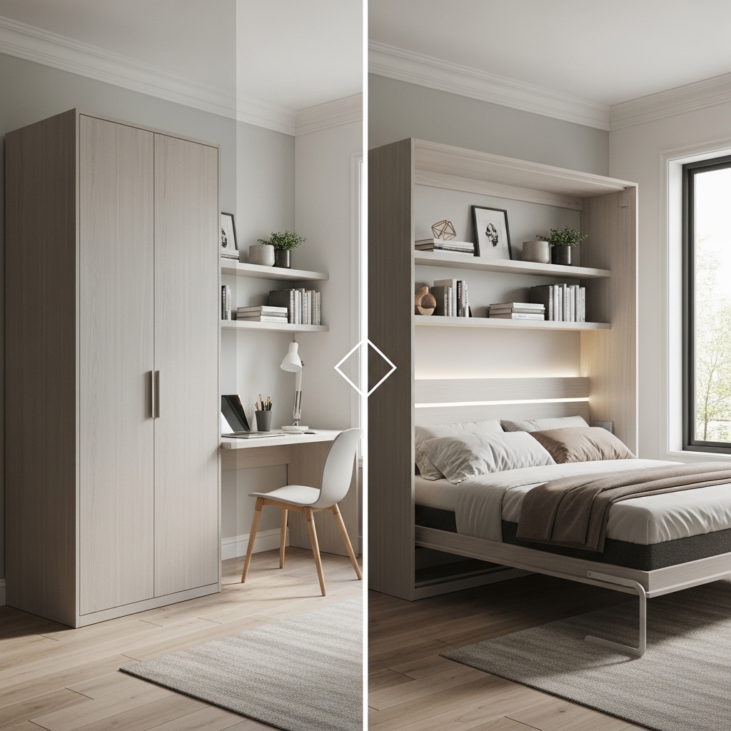 Combining a Murphy bed with a hidden closet maximizes storage while maintaining a clean design. The bed folds into a wardrobe-style unit.