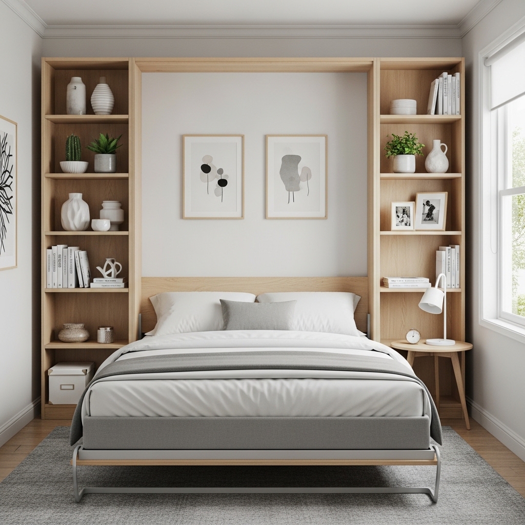Adding open shelves around a Murphy bed creates both storage and decorative opportunities. You can display books, plants, or decor items.