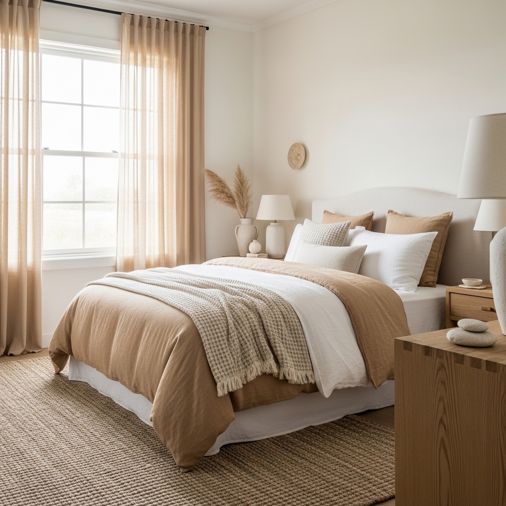 Off-white and sand tones create a light and breezy bedroom inspired by coastal design. This palette feels fresh, calm, and relaxing.
